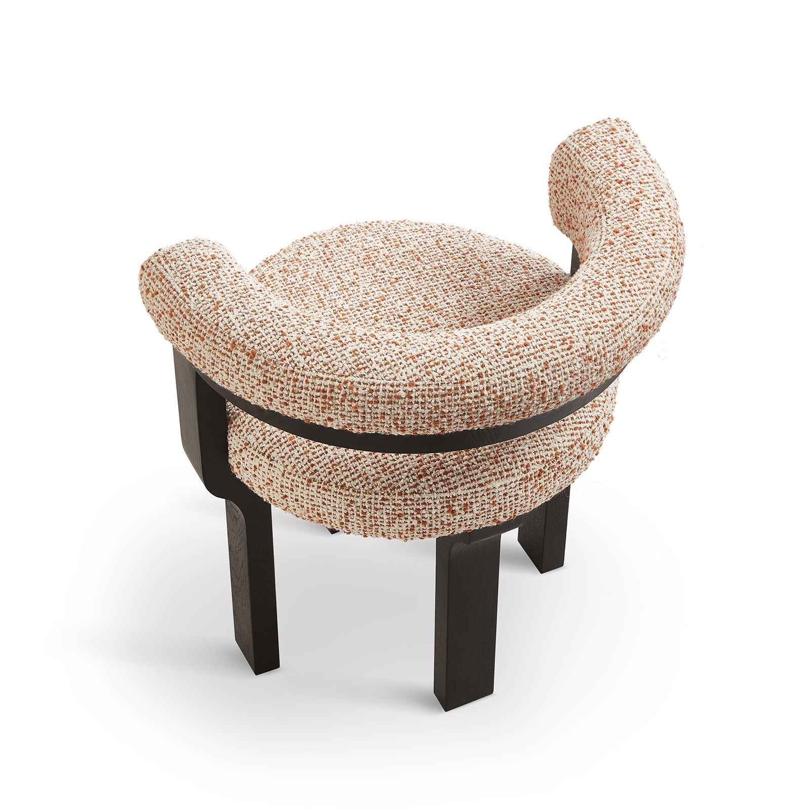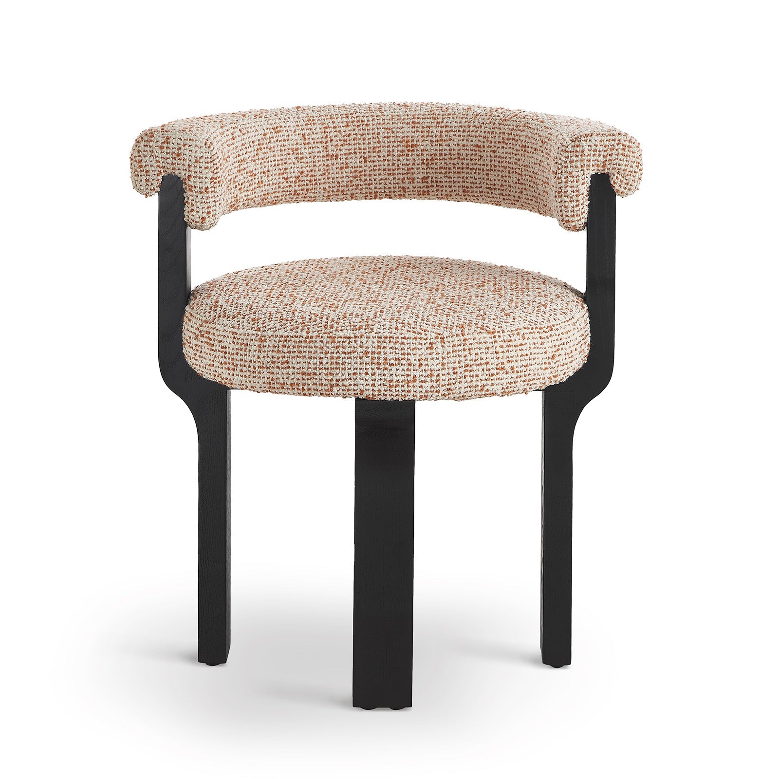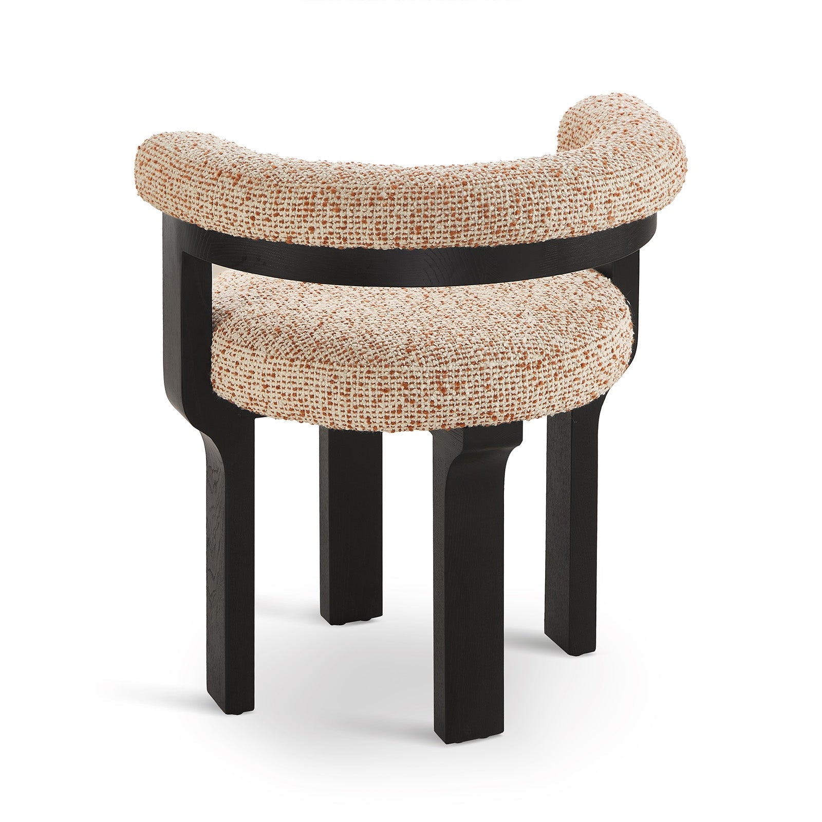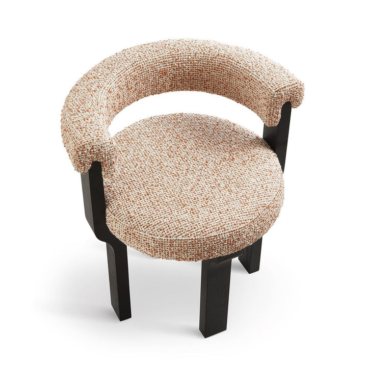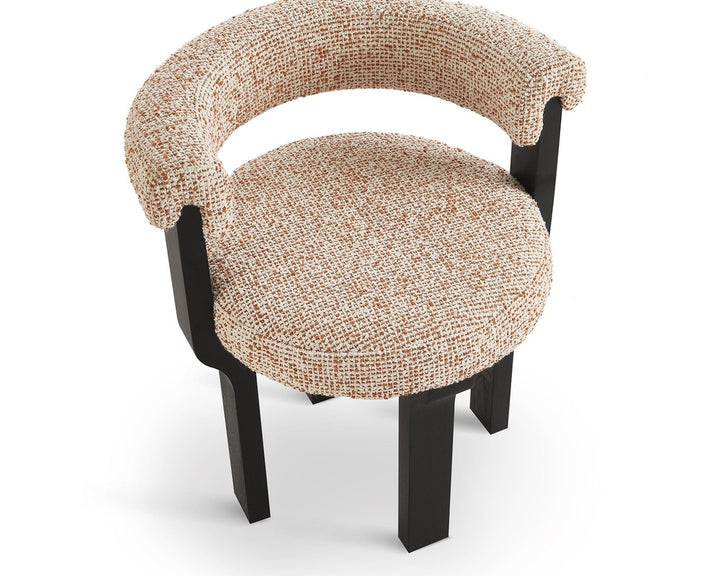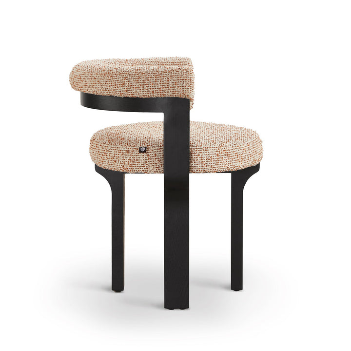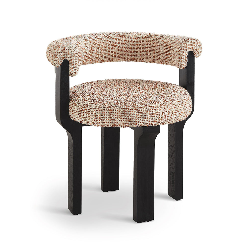 The Elba Dining Chair in Dexter Sparkle Citrus and Matte Black blends sculptural elegance with everyday comfort. Its distinctive silhouette and rich texture in a warm, neutral and rust upholstery make it a sophisticated addition to residential or hospitality interiors.