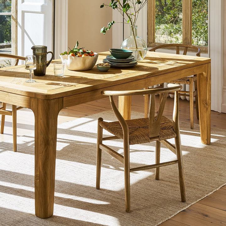 Elcot Dining Table needs very little decor thanks to its gorgeous mosaic pattern. Crafted from recycled teak wood in Indonesia, it's distinguished by its strikingly simple design, which reflects its sturdiness while being softened by its elegant curved lines.