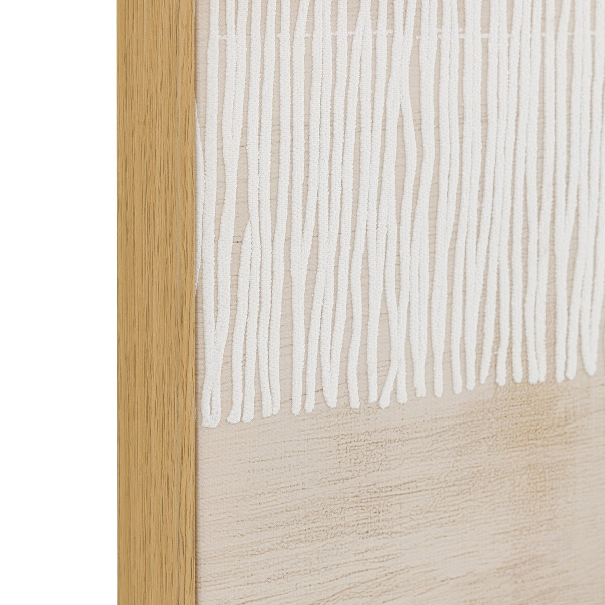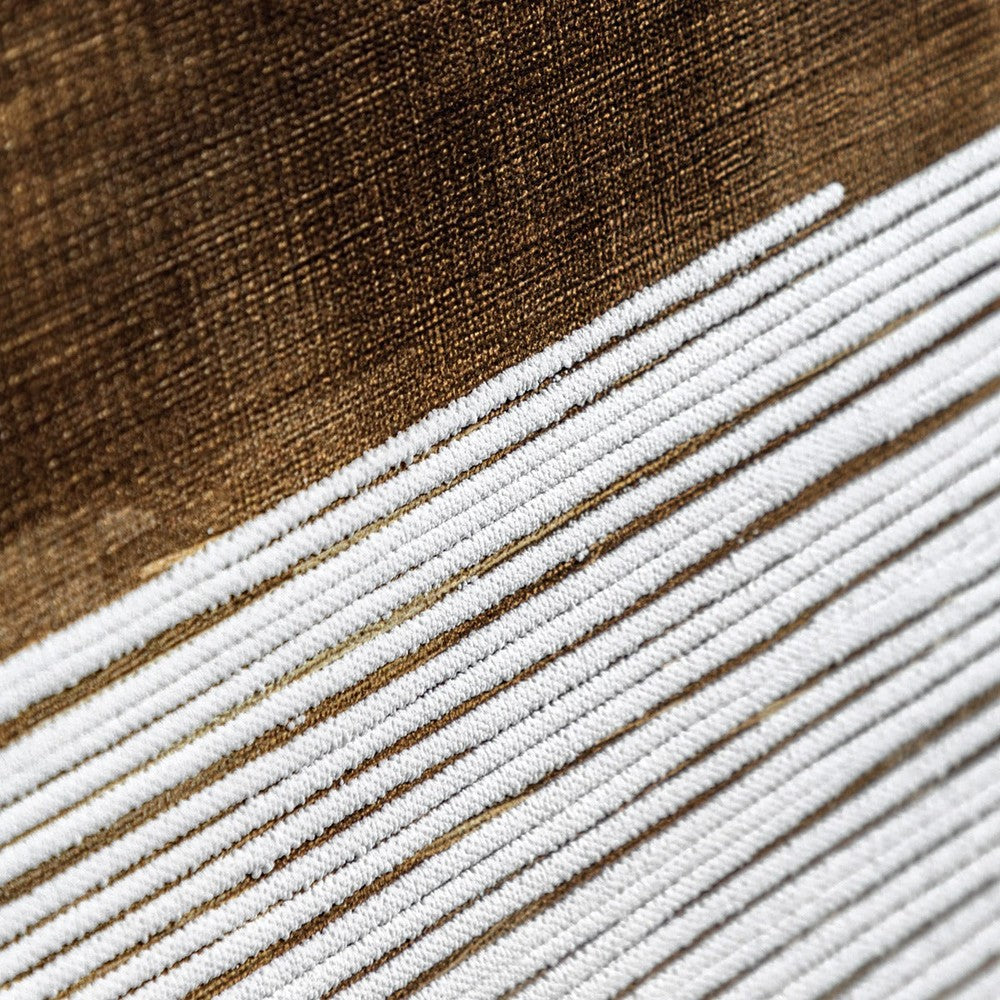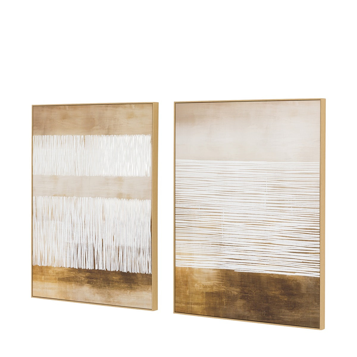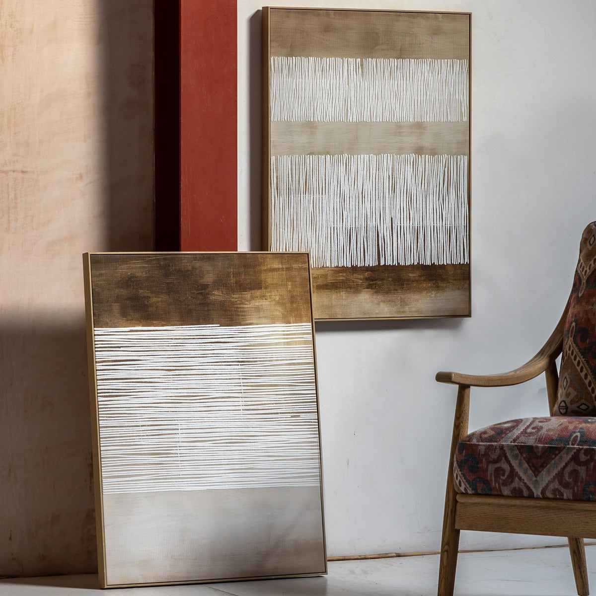 An abstract pair of artworks in antique gold, bronze, natural stone and earthy paint tones with textured white 3D relief lines. One panel depicts a staccato visual rhythm, whilst the other is cascading.