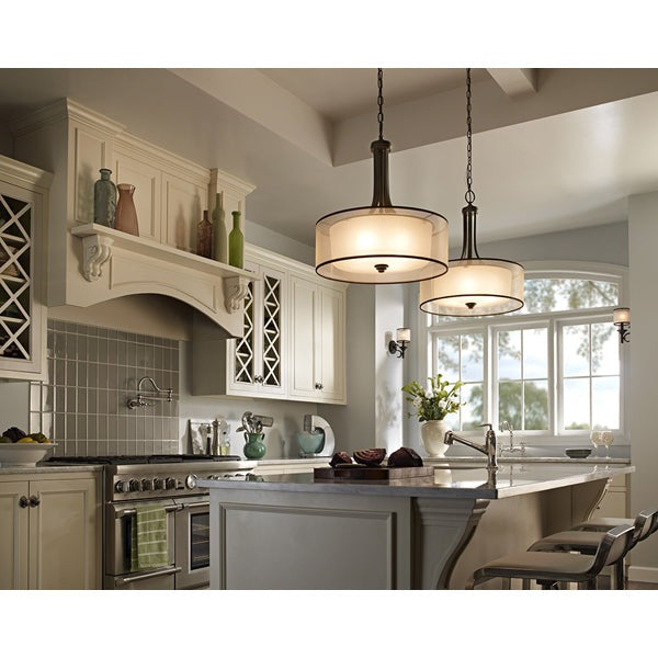 The contrast between the dark bronze frame and the opal glass creates a beautiful lighting feature. This pendant hangs from the ceiling with a metal chain holding a round bronze frame in place that surrounds the glass and mesh shades. It takes four bulbs and combines traditional classic styling with a modern look.