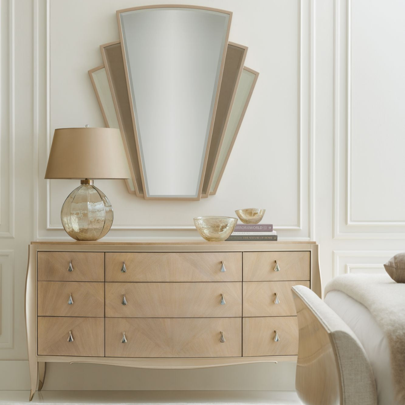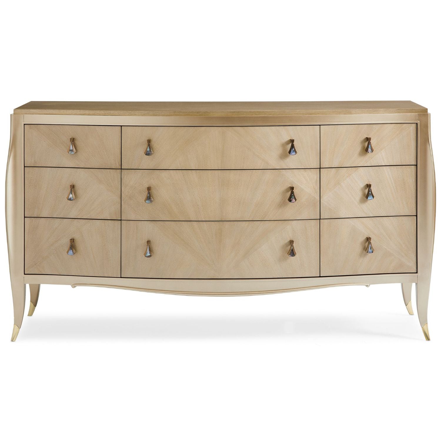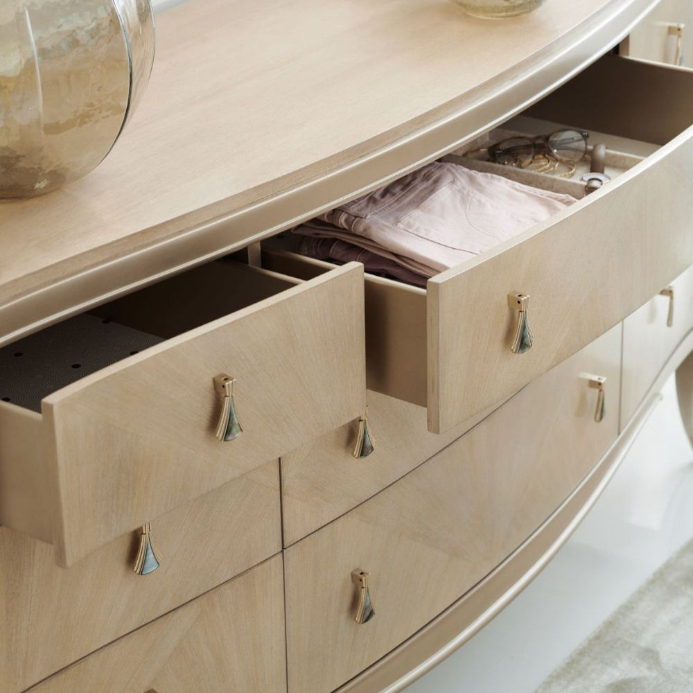 You can't help but be a big fan of this dazzling dresser. A one-of-a-kind fan motif created with Koto veneers finished in Winter Wheat makes an artful statement across its nine drawer fronts. Its distinctive hardware is plated in Champagne Gold and features a gorgeous Mother of Pearl inlay. At the bottom of its top drawer is an Art Deco-inspired silkscreen, while its drawer interiors are in Warm Reflections. Outlined in a lustrous Warm Reflections, its graceful silhouette is completed with metal-plated ferrules in Champagne Gold. Case is finished in Winter Wheat. Drawer fronts are fan-patterned Koto veneer finished in Winter Wheat.Solids are painted in Warm Reflections. Six soft-close drawers with undermount guides. Top drawer bottom features an art deco inspired silkscreen. Drawer interiors in Warm Reflections. Metal plated ferrules in Champagne Gold. Hardware is Champagne Gold with Mother of Pearl inlay.