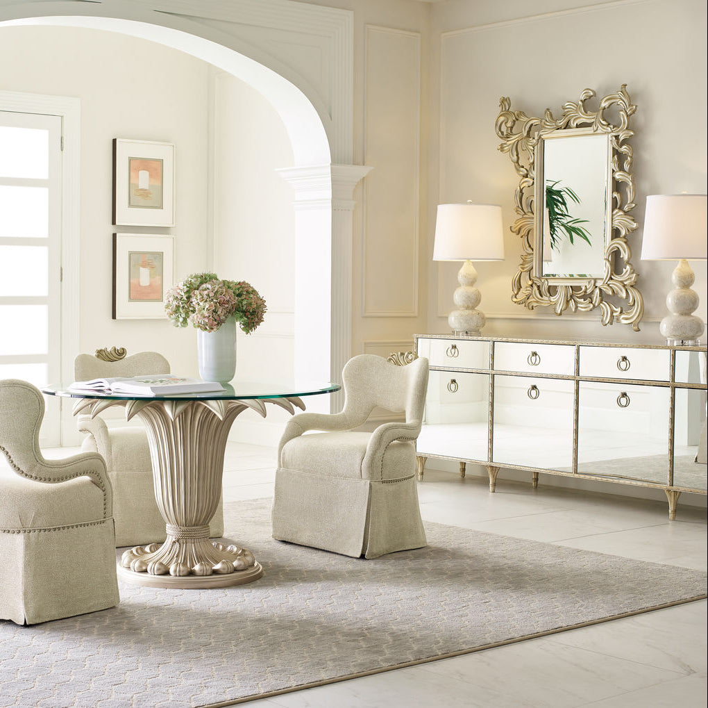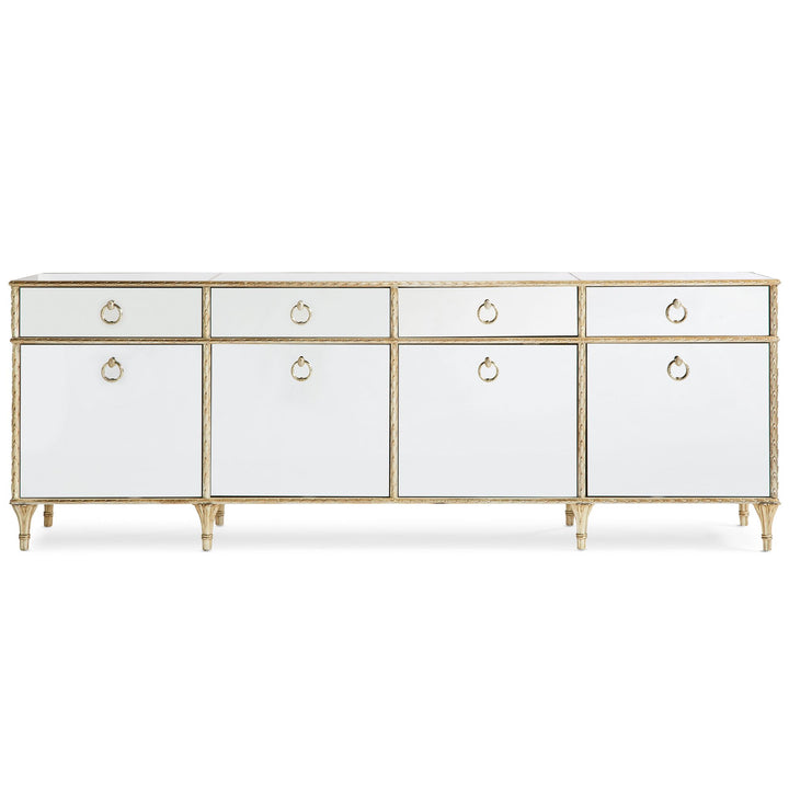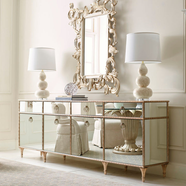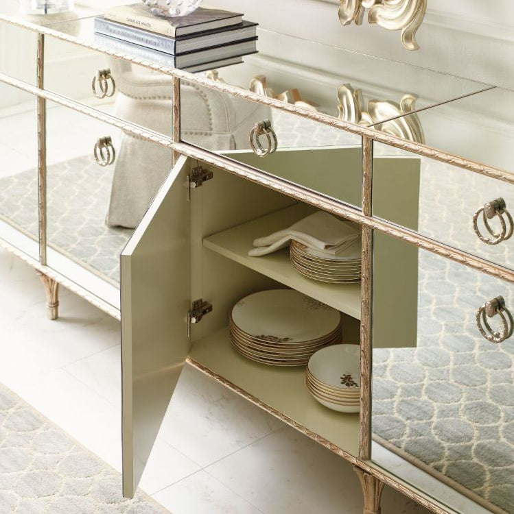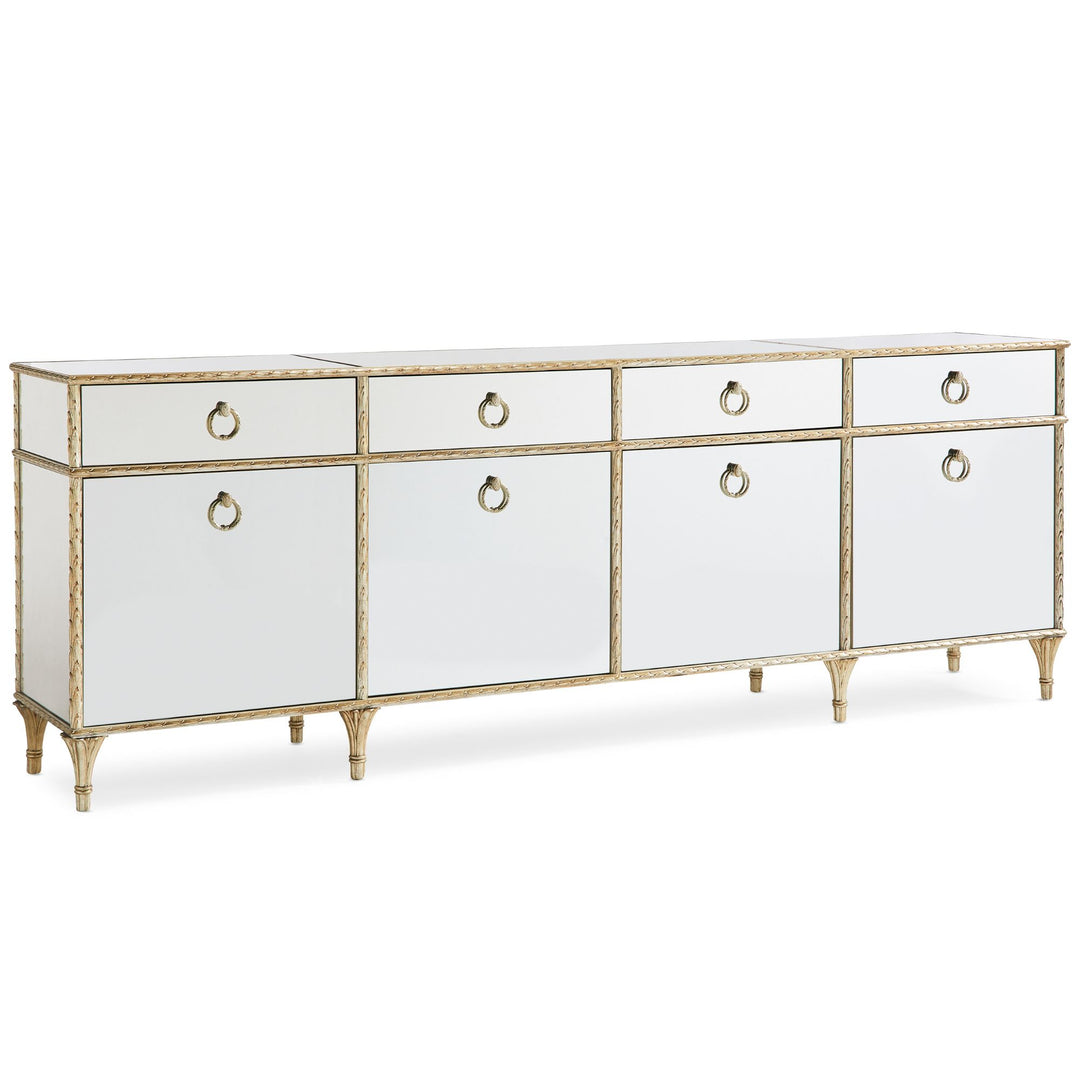 A favourite among both men and women, this stunning media console offers a much-needed design solution for displaying today's televisions and electronics. While substantially scaled to accommodate today's largest flat screens, its mirrored exterior reflects the beauty of its surroundings and conveys a feeling of lightness. Its remarkable frame is inspired by antique Baroque picture frames and highlighted in an Aglow finish. Behind each of its four doors you'll find an adjustable shelf while ventilation and cord management holes provide added functionality. Stunning cast ring-pulls adorned with cameo buttons highlight the front of this extraordinary cabinet and are reflected in its mirrored surfaces. Expertly combining old-world influences with modern luxury, this multifunctional media console makes an exceptionally beautiful home accent. Case finished in Aglow Mirrored top, sides and front. Four drawers with soft-close undermount guides.Four doors with one adjustable shelf behind each door. Cast aluminum feet.CrËme de la CrËme case interior. Ventilation and cord access hole in back.