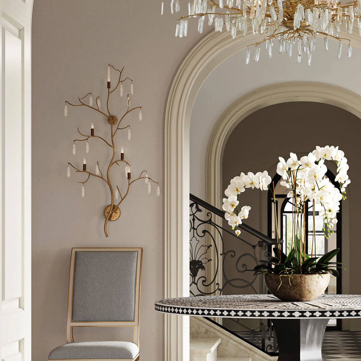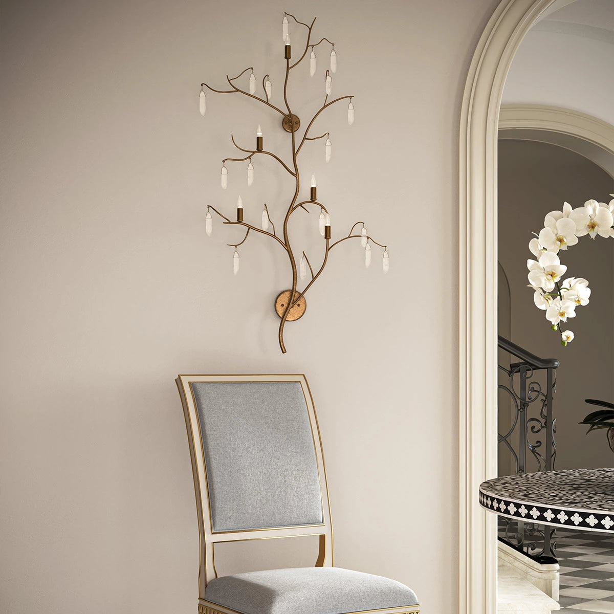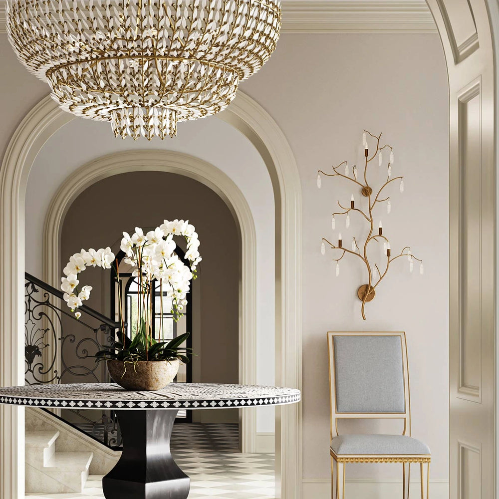 The Forest Light Wall Sconce is an exceptional work of art dripping with quartz crystals. The beautiful washed Lucerne gold finish is a perfect complement to the quartz on this gold wall sconce.