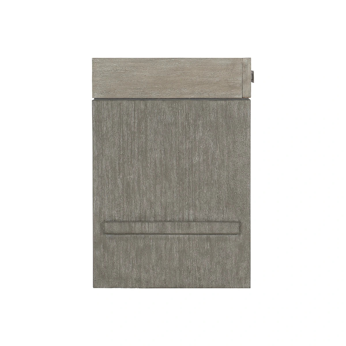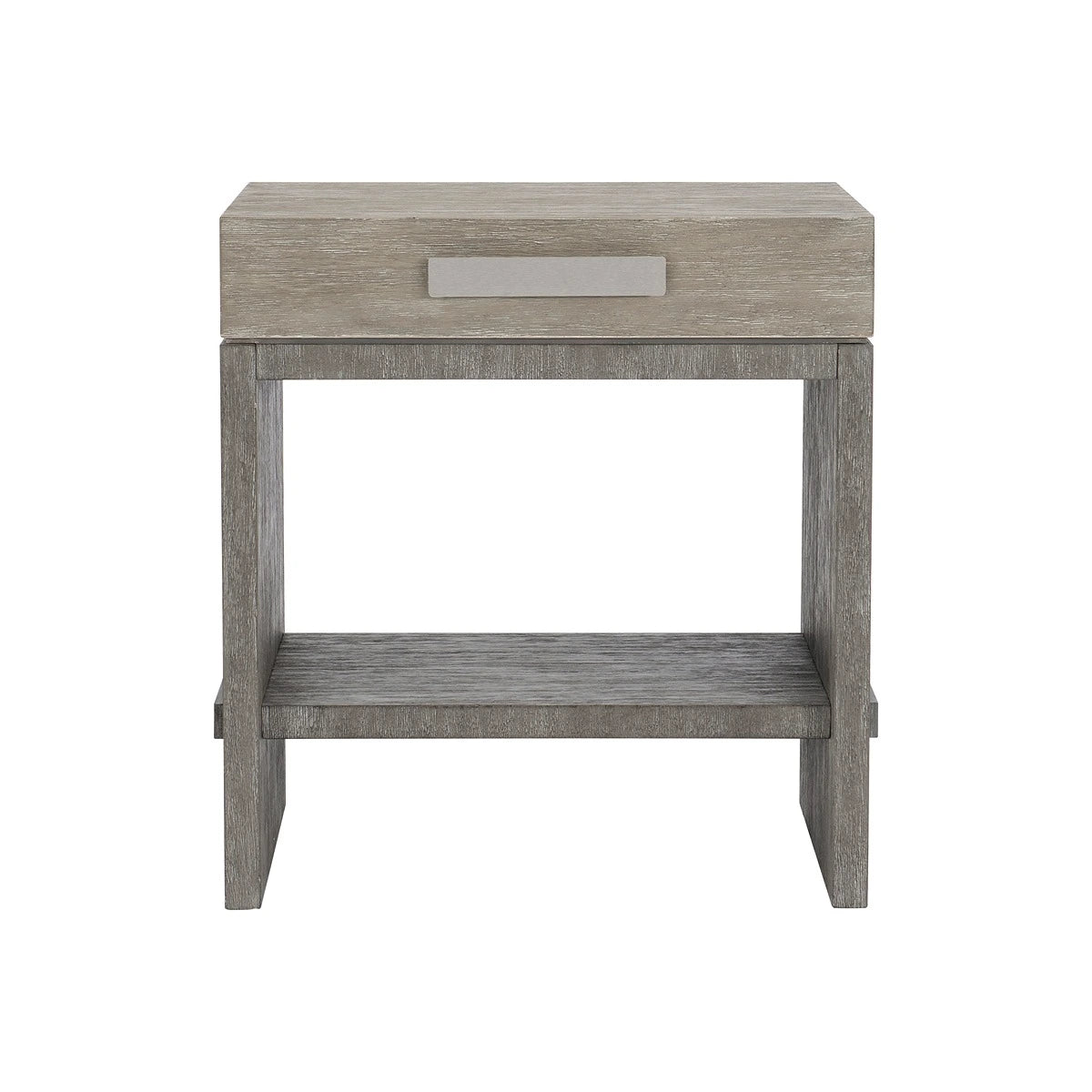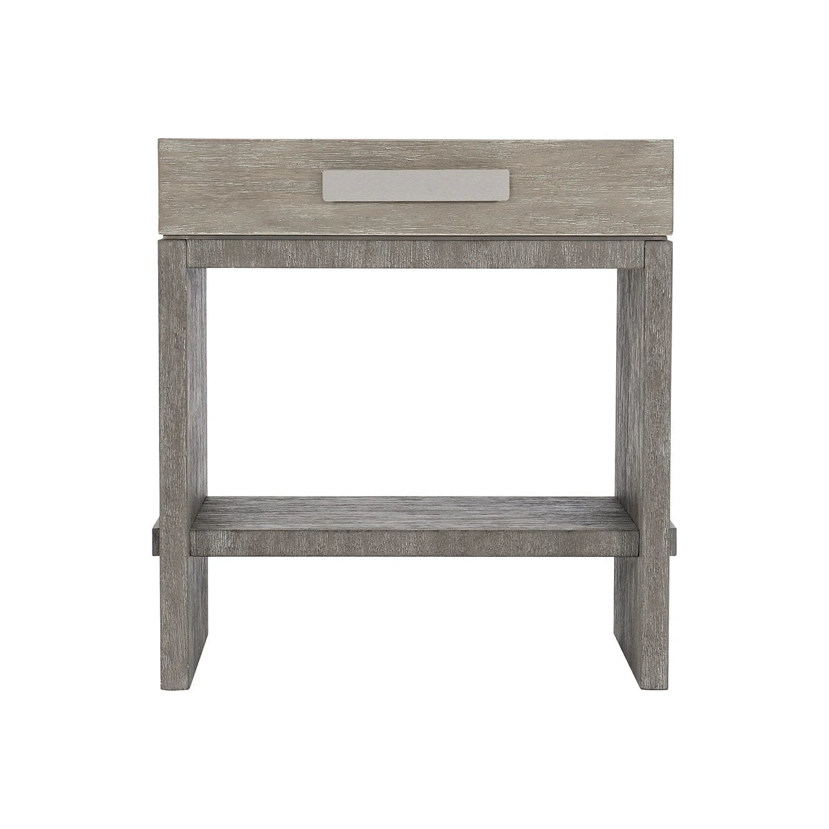 Foundations is a new, refined expression of modern rustic, defined by a minimalist style and relaxed finishes. Crafted from cerused, wire-brushed acacia, the Foundations nightstand offers rustic style with a contemporary touch. Clean lines and intersecting planes create a sophisticated design aesthetic, softened by a palette of oyster and driftwood grays. A brushed stainless steel pull on its single drawer adds a subtle accent to the simple form.