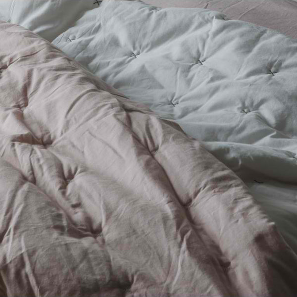 This fresh and crisp cotton blush bedspread has contrast white cross stitch detail and flat piping with a coordinating blush cotton reverse. Available in 2 colourways and in matching cushions.
