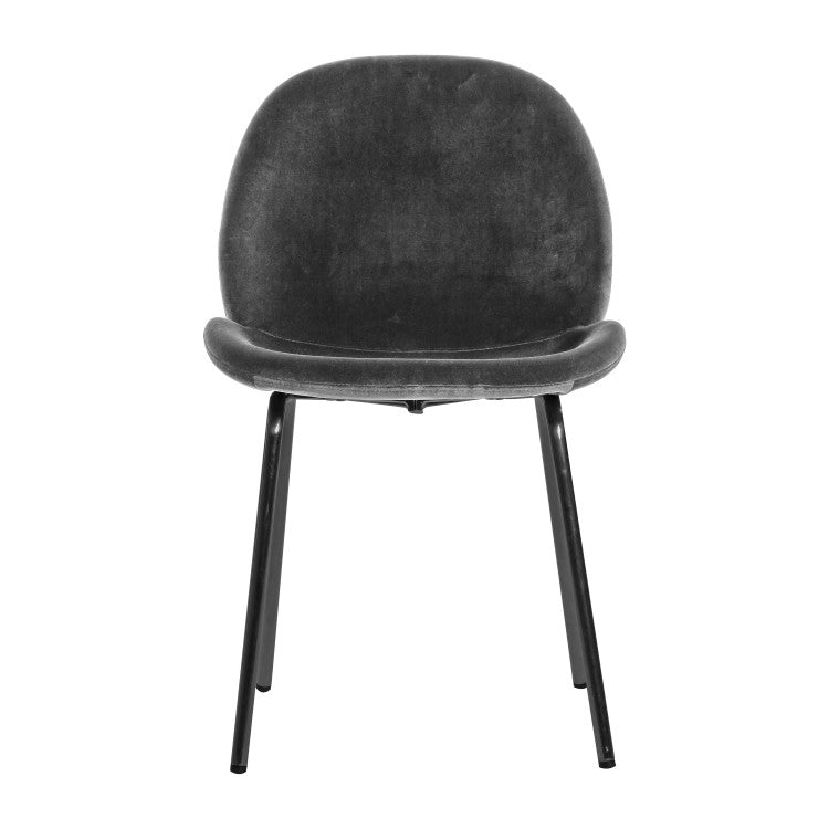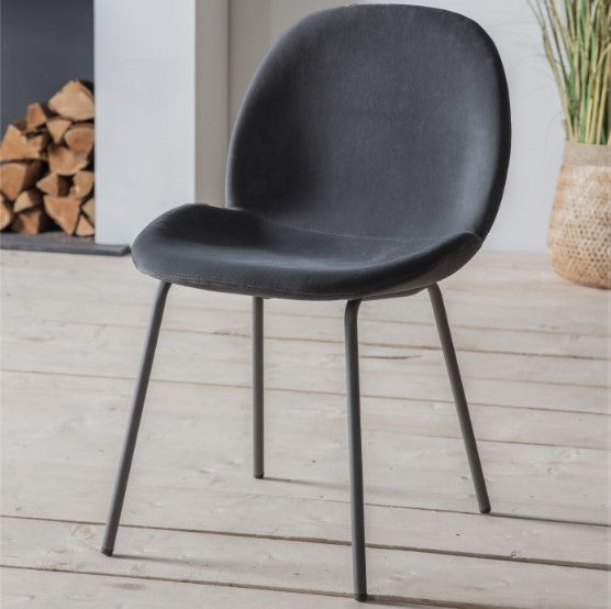 This dining chair offers simple, contemporary design, with its sleek seat and metal base. The grey velvet pairs perfectly with the graphite finish of the base to give a chic sophisticated look. Available in four other colours, and there are also bar stools in three colours.