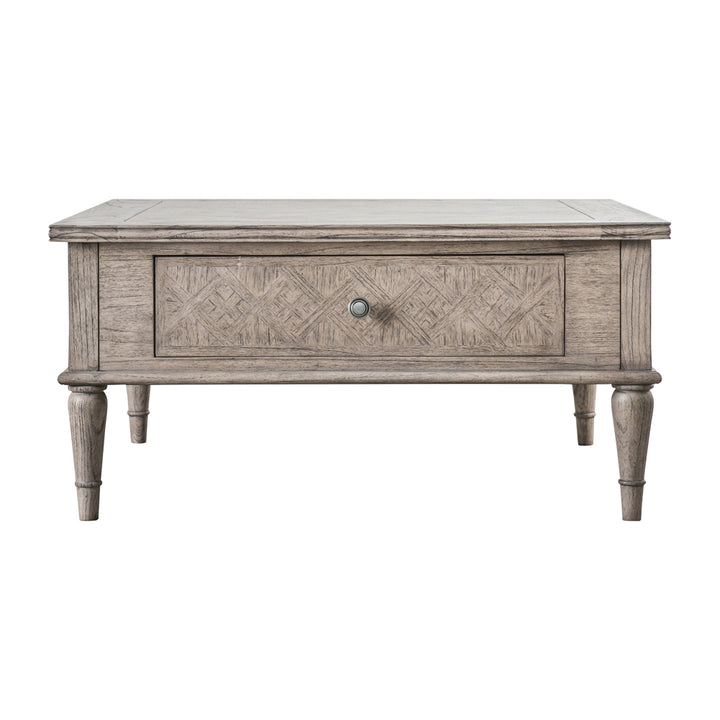 This collection offers a wide range of living, dining and bedroom furniture pieces, crafted from Mindy wood with a stunning inlaid parquet-style design. The lightly brushed finish recreates the natural ageing effect. With its classy design and subtle finish, it offers versatile style that would suit a wide range of interiors.\n\nThis square 2 drawer coffee table adds practical style to a living room. The two drawers, one on either side of the table, are ideal for helping to keep tidy. The top and drawer fronts feature the signature parquet-style design, whilst elegant turned legs add a sophisticated finish to the table.
