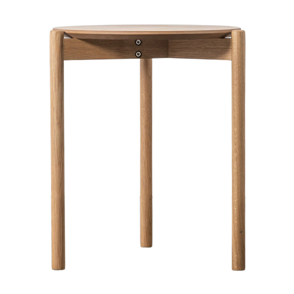 Stylish oak side table offering a simple yet stunning design. The circular top is crafted from oak veneer, with a lovely natural finish which shows the grain of the wood. It sits on the solid oak base, with the ends of elegant round legs showing to echo the shape of the top. A matching coffee table is available, and both are also offered in a black and a walnut finish.\n\nThe collection is part of our Packed-Flat Design Project, offering easy delivery to any room in any property, whilst reducing the packaging needed. Easy assembly is required, but all the tools needed are supplied.