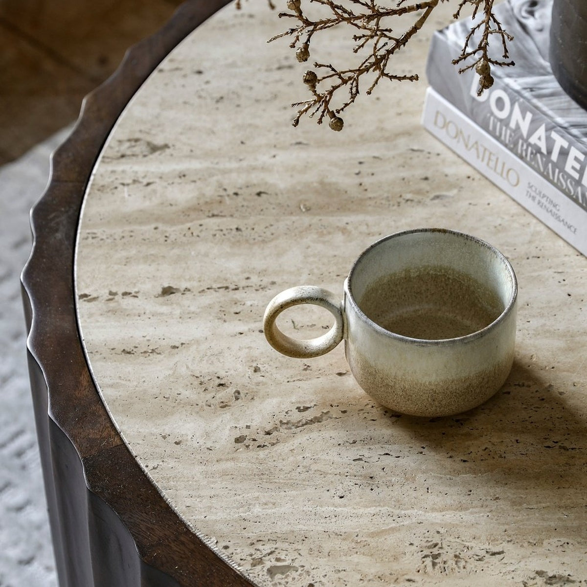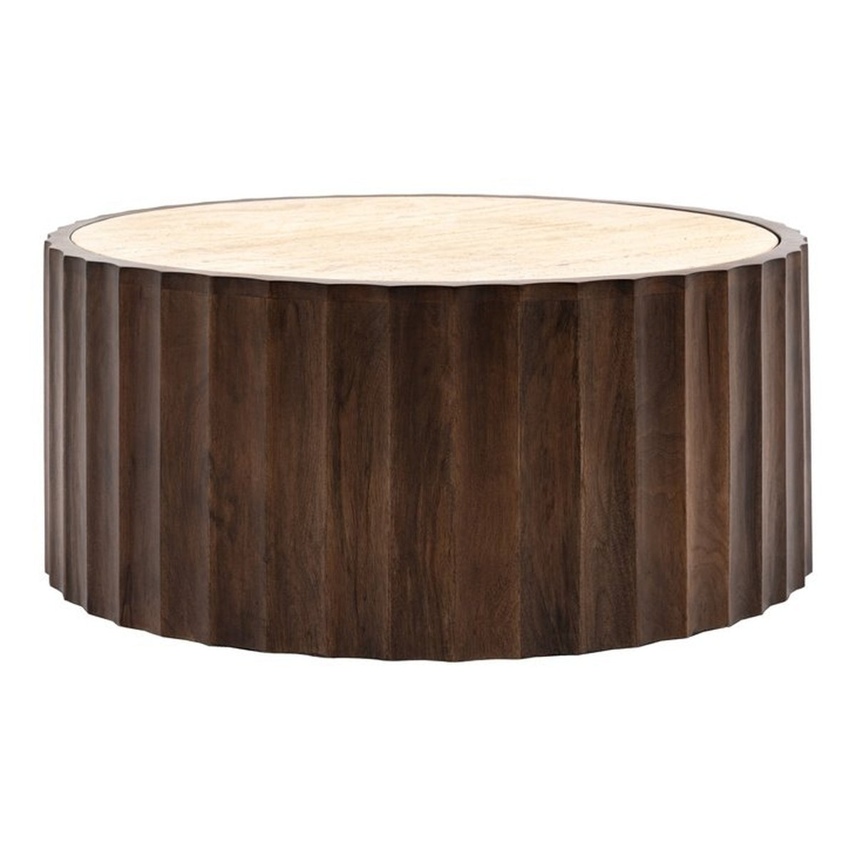 This stylish unusual coffee table features a round drum base crafted from mango wood with beautifully scalloped edges paired with a travertine stone inset top. A matching side table is also available.