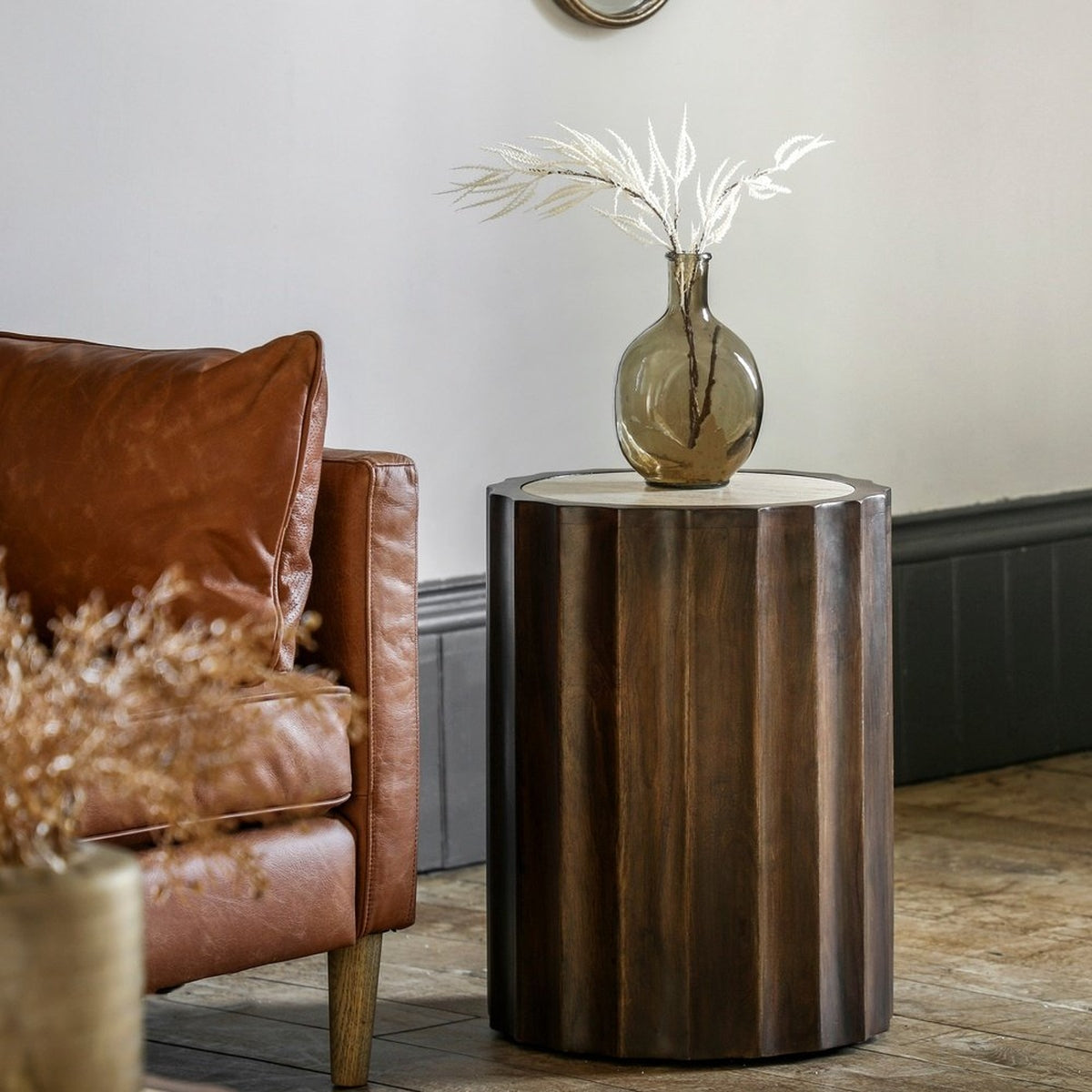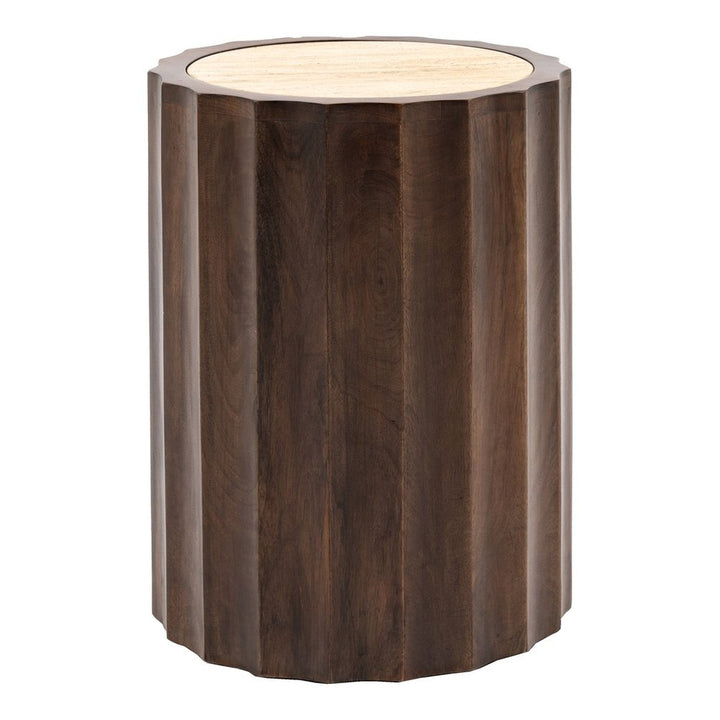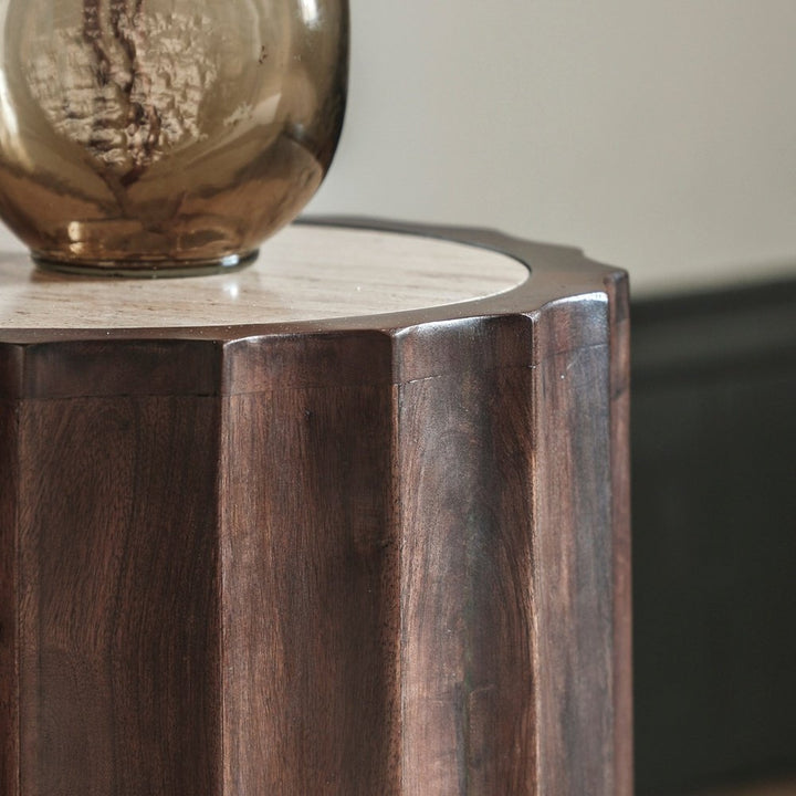 This stylish unusual side table features a round drum base crafted from mango wood with beautifully scalloped edges paired with a travertine stone inset top. A matching coffee table is also available.