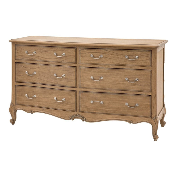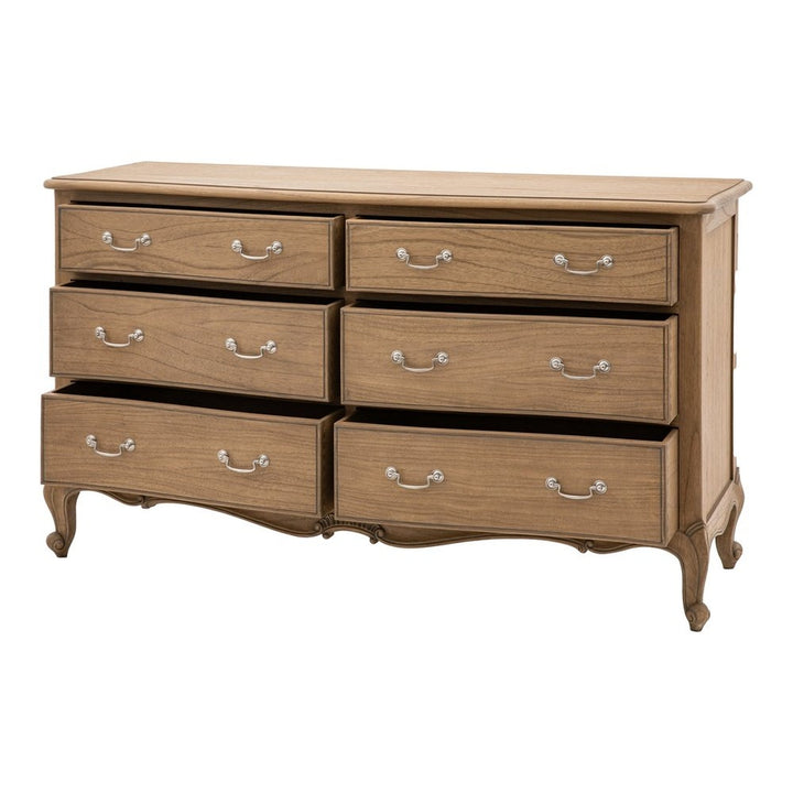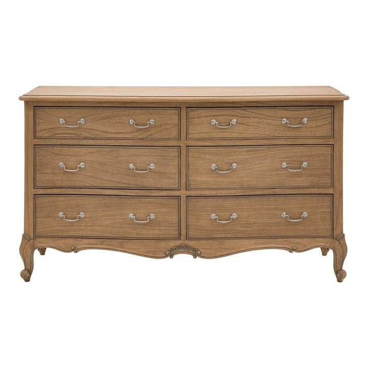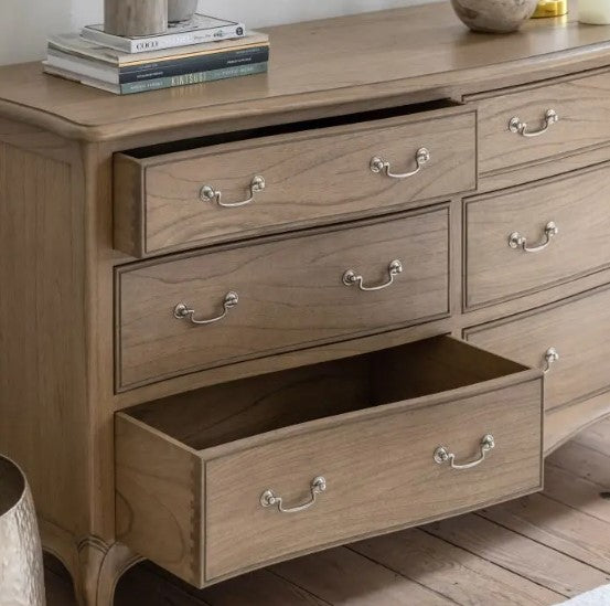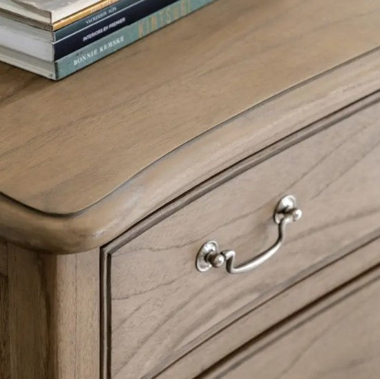 Heavily influenced by traditional French furniture designs, this beautiful chest of drawers exudes style and quality. The weathered finish shows the lovely grain of the Mindy ash with classy handles completing the look. Matching pieces available.