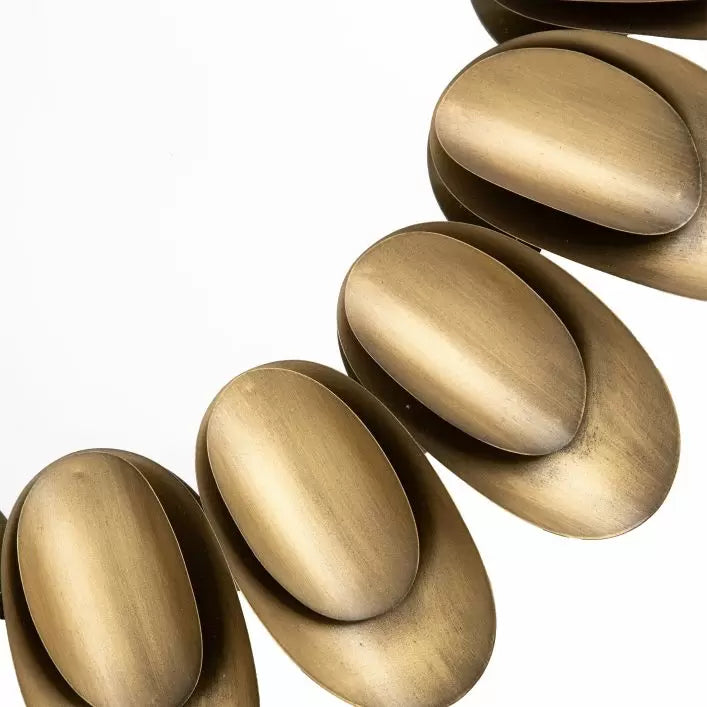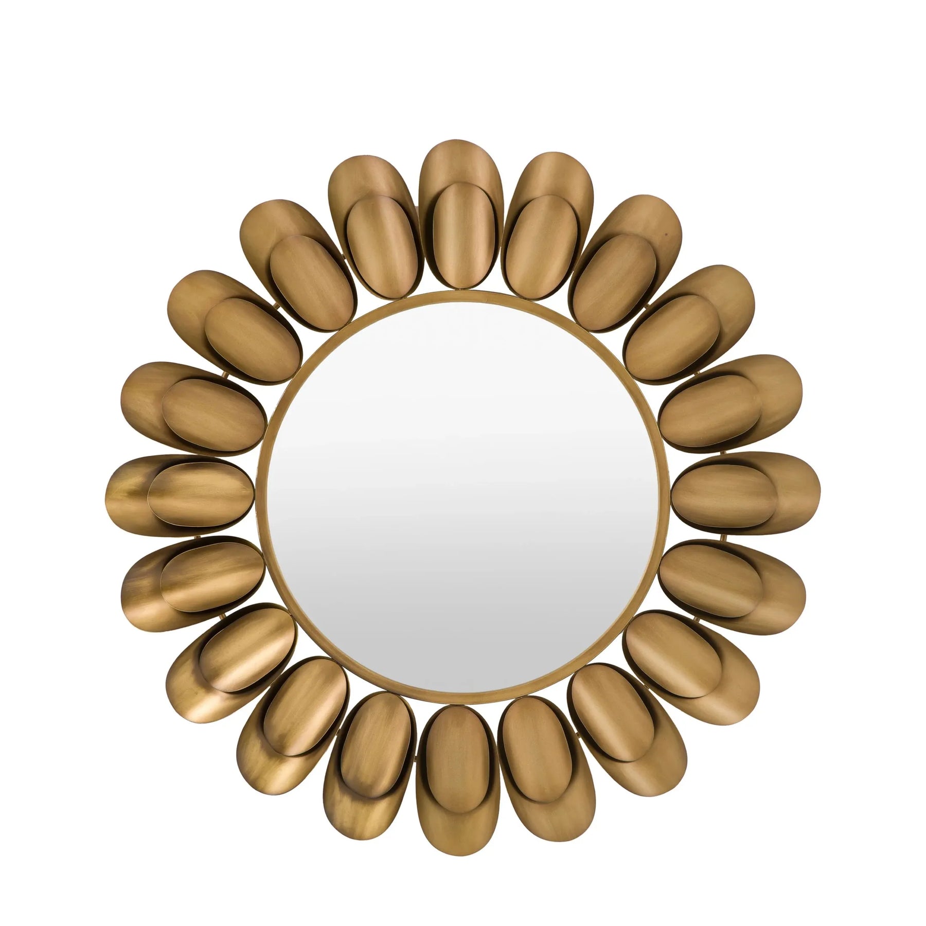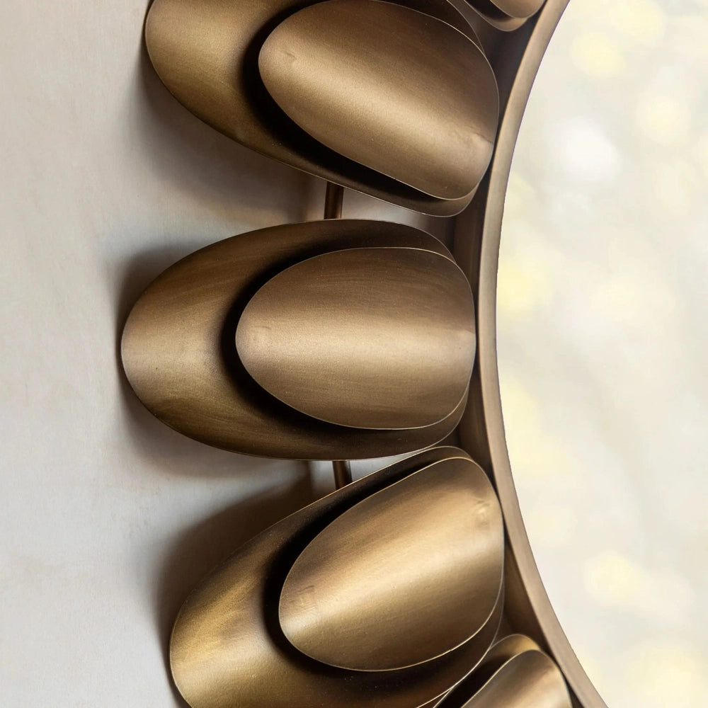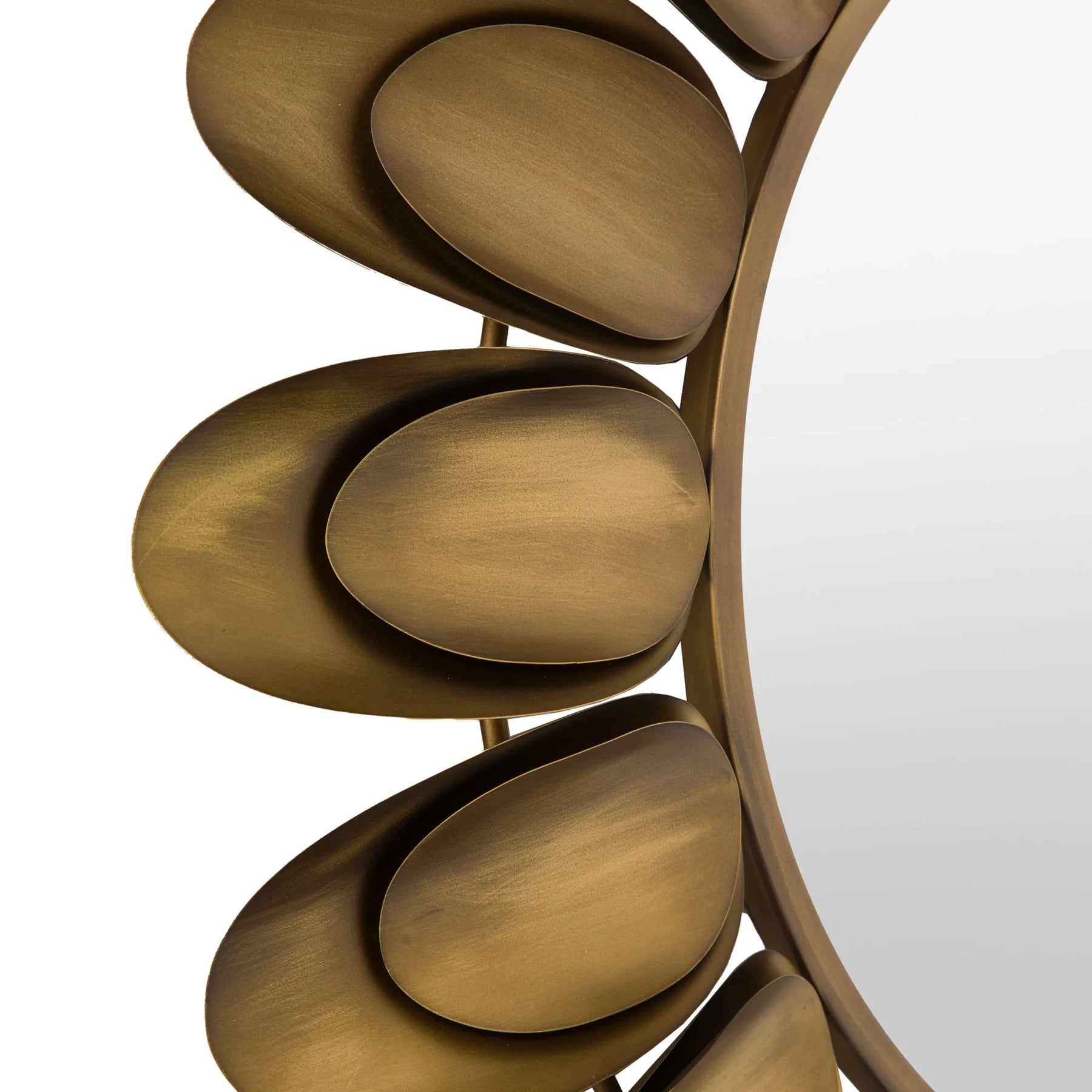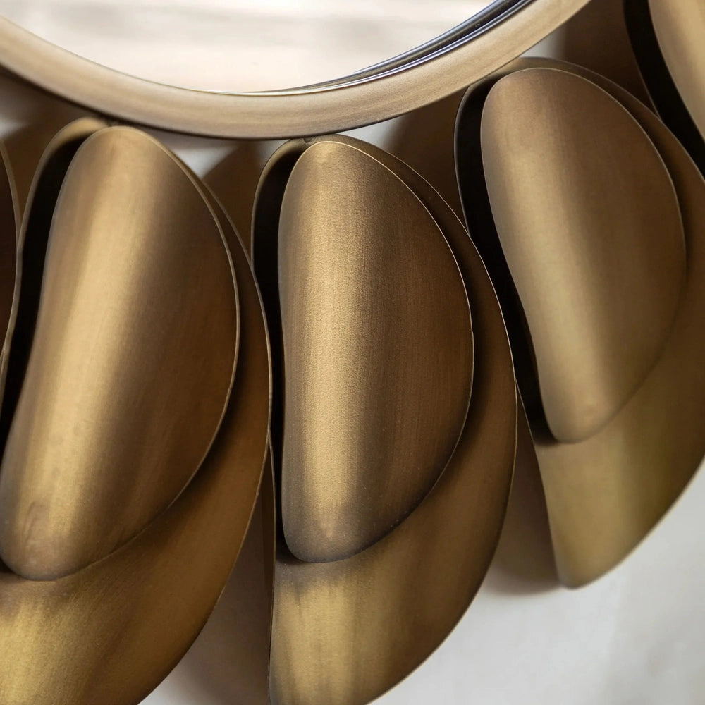 This opulent statement mirror features curved metal pieces encircling the mirror in a brushed bronze finish. The mirror's contemporary design allows it to enhance any modern interior style.