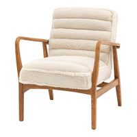 Featuring a sleek wooden frame with beautifully curved arms, this chair is upholstered in a luxury cream sheepskin fabric, offering both style and cozy relaxation.