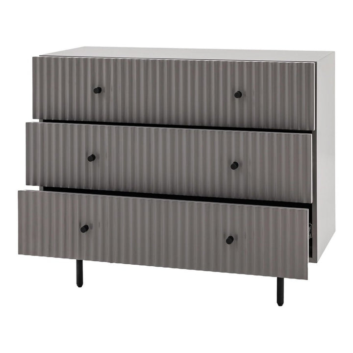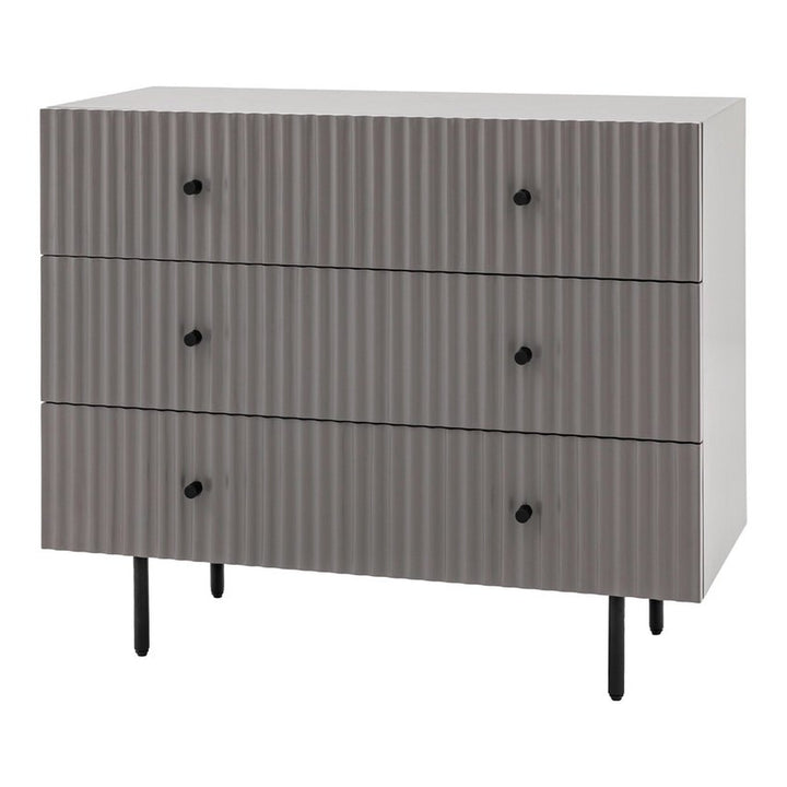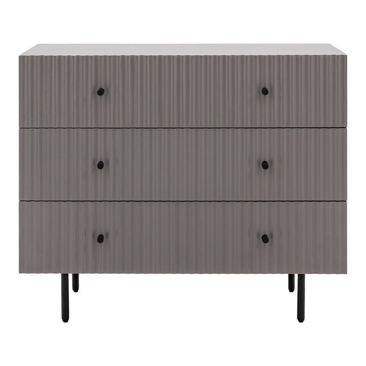 The drawer fronts of this lovely chest of drawers, in a grey painted finish, feature a stylish vertical scalloped design, giving a unique upmarket look. Black metal legs and handles complete the look. Perfect for any contemporary apartment interior, the wardrobe would equally at home in a wide range of interiors. Matching pieces available. Also offered in white and blue.