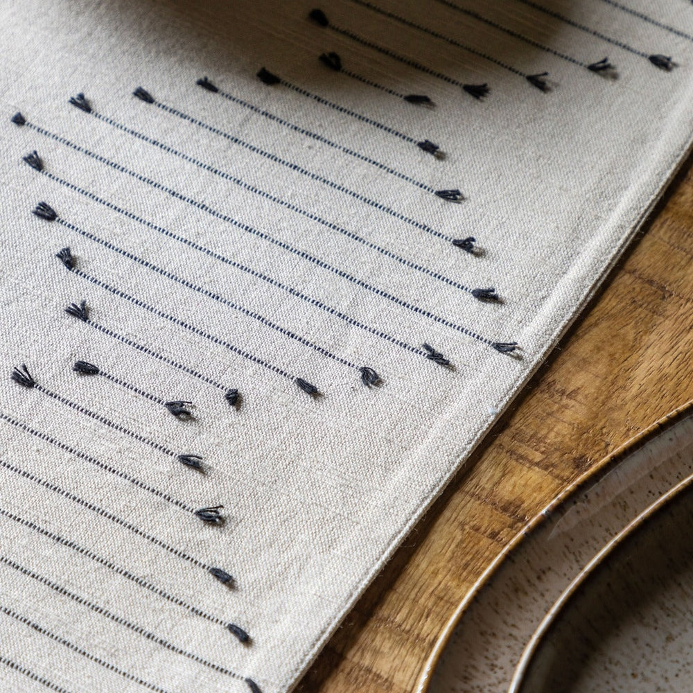 Beautifully subtle style for your table, with natural cotton linen offset by delicate graphic diamond weave embroidery.