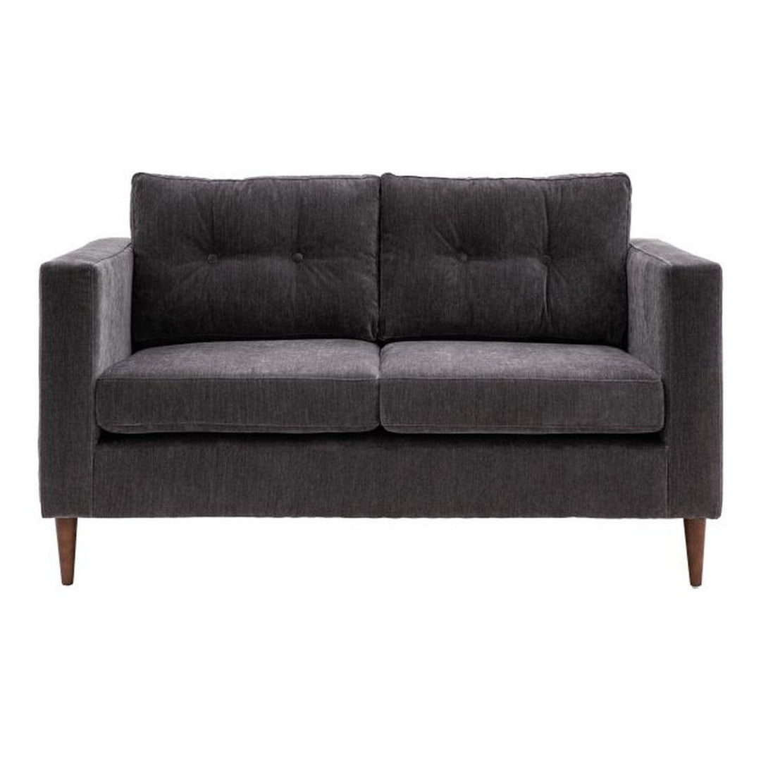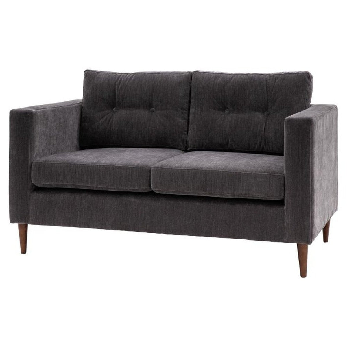 Ideal for contemporary style interiors, this lovely sofa features sleek lines with block arms and button detailing on the back cushions paired with elegant tapered wooden feet. It is upholstered in a lovely charcoal grey fabric but is also available in green and natural. A matching armchair and 3-seater sofa are available.