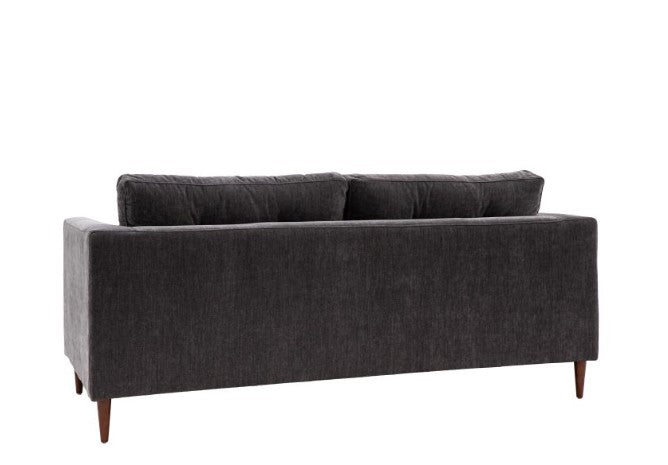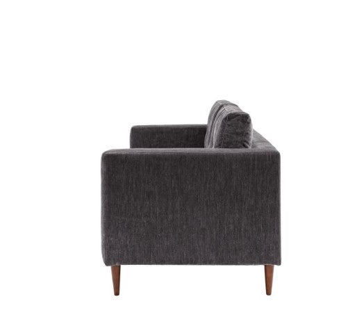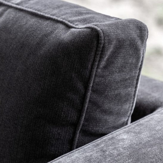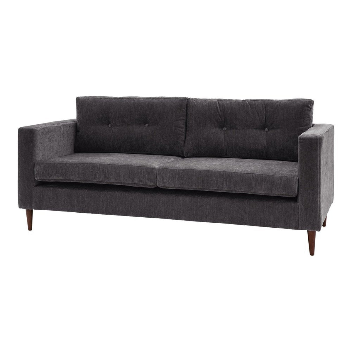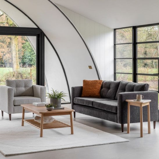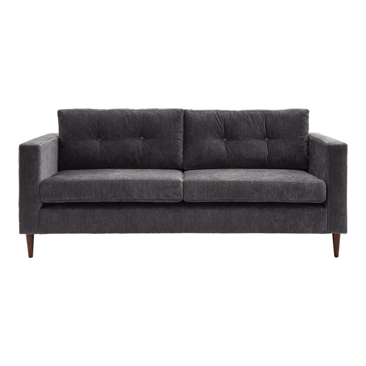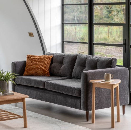 This lovely sofa features sleek lines with block arms and button detailing on the back paired with elegant tapered wooden feet, offering stylish contemporary design. It is upholstered in a lovely charcoal grey fabric but is also available in green and natural. A matching armchair and 2-seater sofa are available.