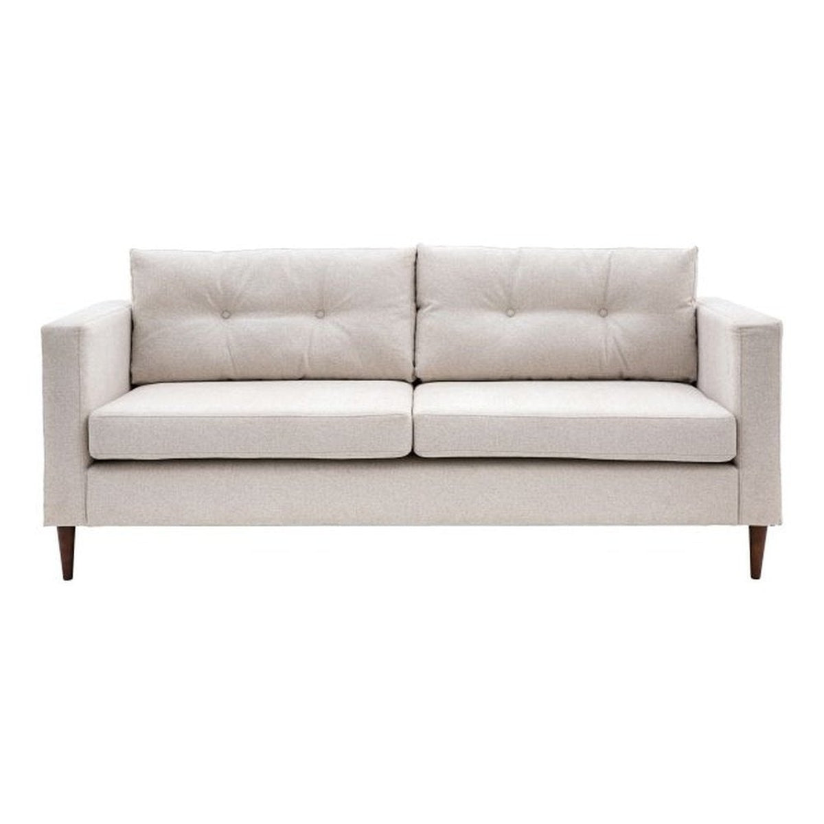 This lovely sofa features sleek lines with block arms and button detailing on the back paired with elegant tapered wooden feet, offering stylish contemporary design. It is upholstered in a lovely natural coloured fabric but is also available in green and grey. A matching armchair and 2-seater sofa are available.