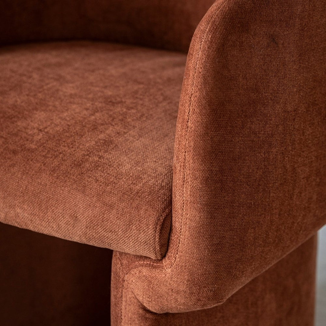 Vintage inspired this dining chair is full of retro cool. The curved tub chair back leads into the curved base, all upholstered in smooth rust red fabric. The perfect fit for both modern and vitage inspired interiors this dining chair won't go unnoticed. Also available in green, cream and grey colour options.