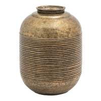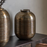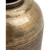 Characterful beaten aluminium vases, finished to evoke the look of antiqued brass. Light in weight but with an aesthetic which implies a heavy, hand crafted element. Designed to make a bold statement either as planter or outsized objet.