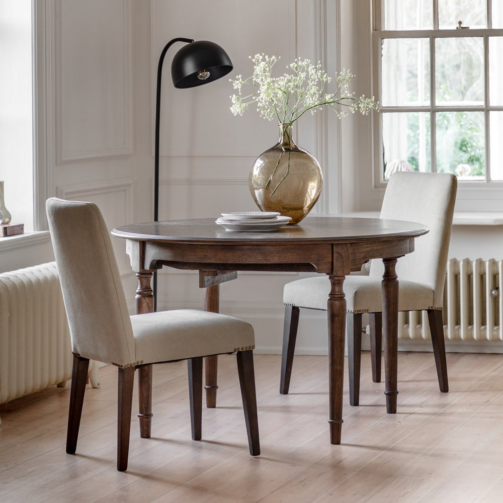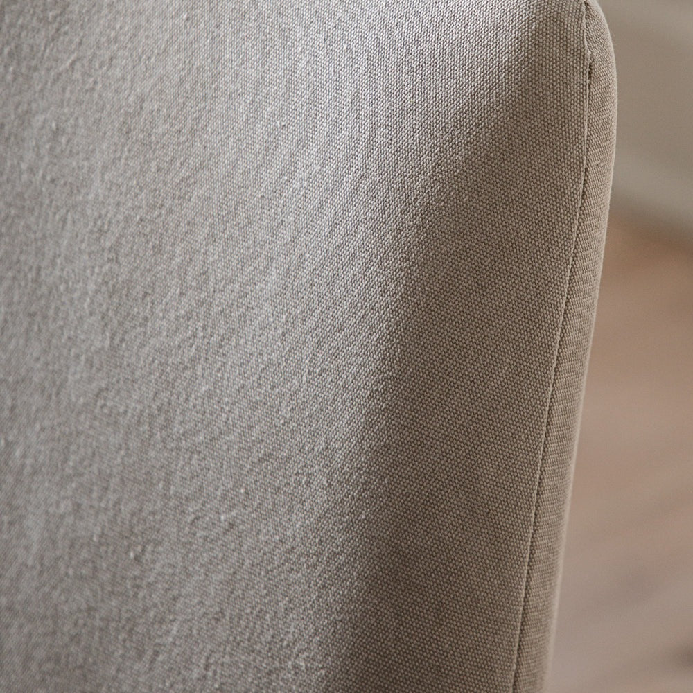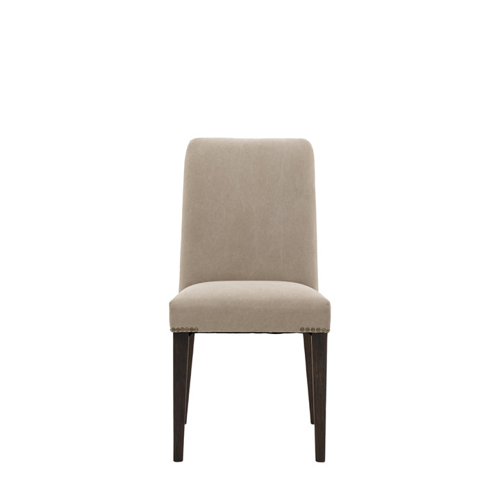 Set of 2 dining chairs perfectly suited to both modern and traditional interiors. The seat and back are upholstered in a neutral grey linen, with metal detailing, which pairs perfectly with the exquisite dark salvages coffee colour timber legs.