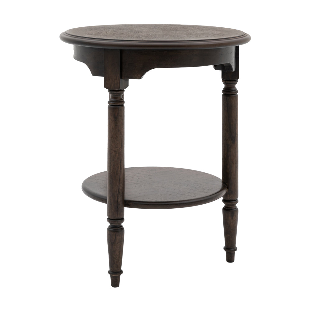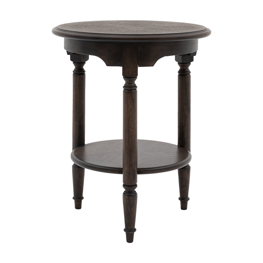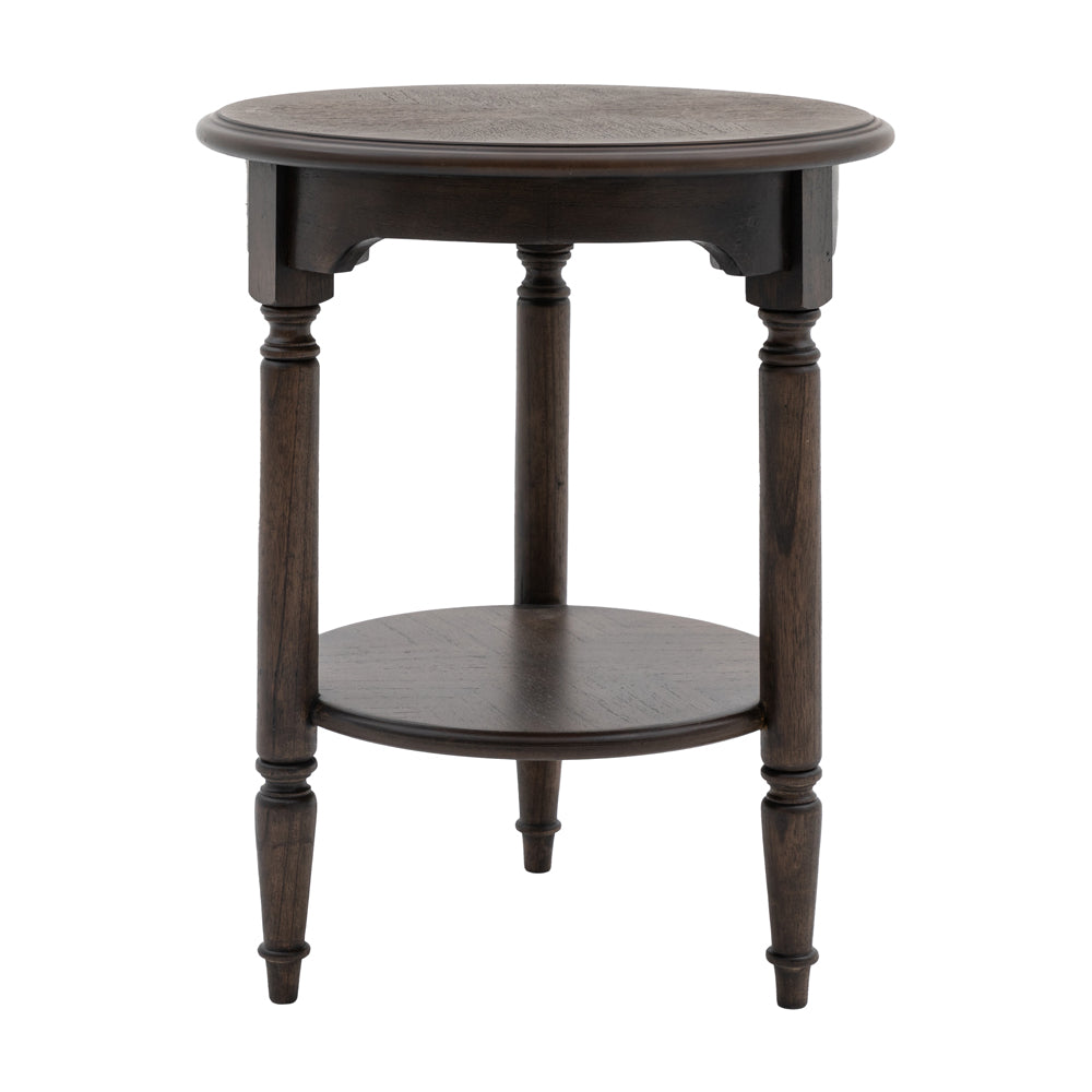 Offering a ‘new traditional’ look, with a timeless, elegant style and modern touch, this stunning side table features exquisite dark salvaged coffee coloured Mindy wood solids & veneers. The book matched marquetry detail and turned spindle legs create a stunningly elegant side table.