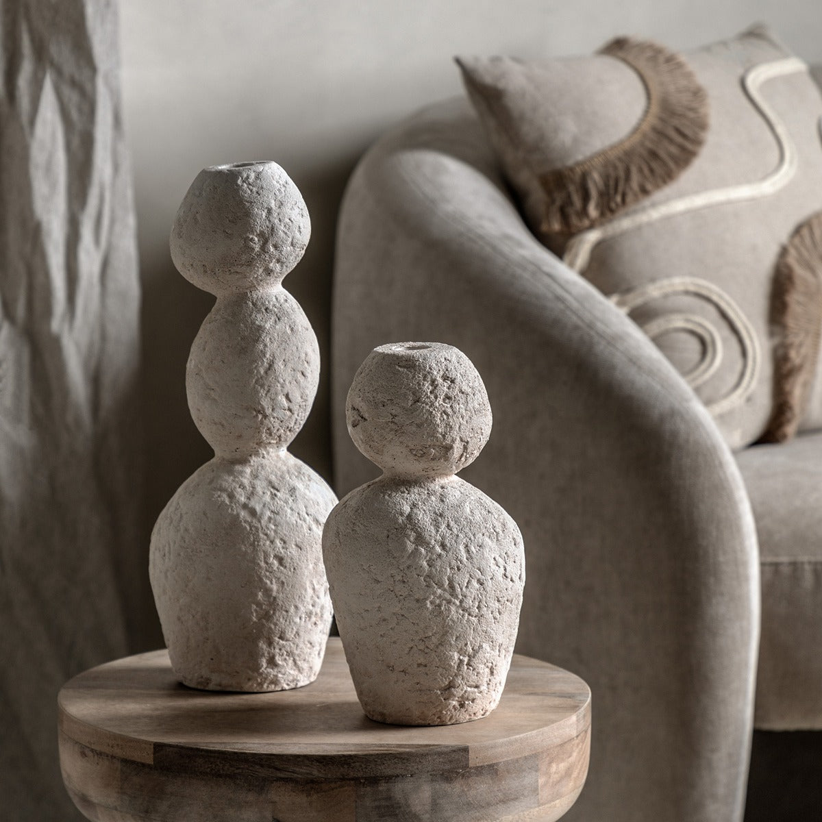 A natural ceramic taper candle holder design, with a shape which evokes stacked pebbles.