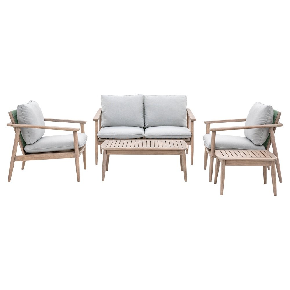 A contemporary lounge set with chic turned legs, slopped arms and a overall elegant design finished off with grey cushions, perfect for your outside space. Complete with a 2 seater sofa, 2 armchairs and a slatted top coffee table all made from Acacia wood with woven rope chair backs.