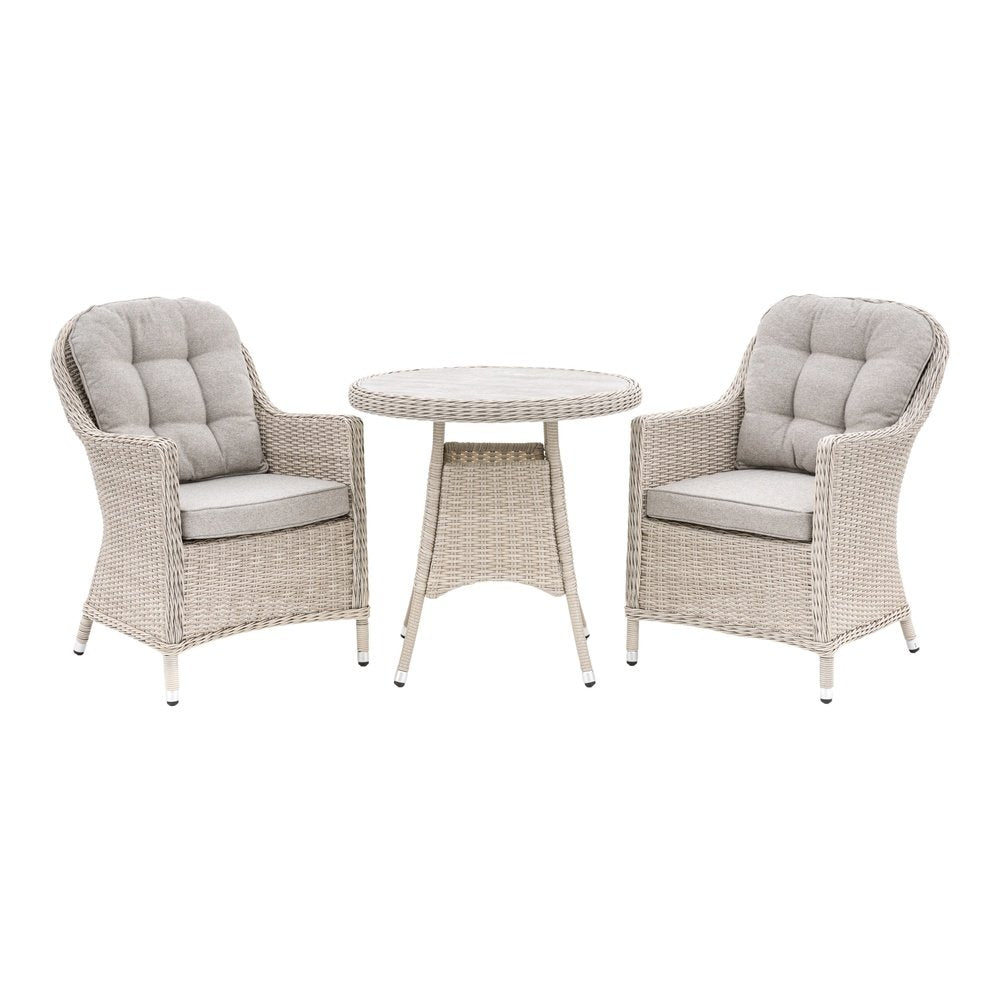 Sit back and enjoy the summer sun with this elegant bistro set. Made with woven weather resistant polyrattan the 2 comfortable chairs are finished with light grey cushions while the bistro table boasts a practical ceramic glass top .