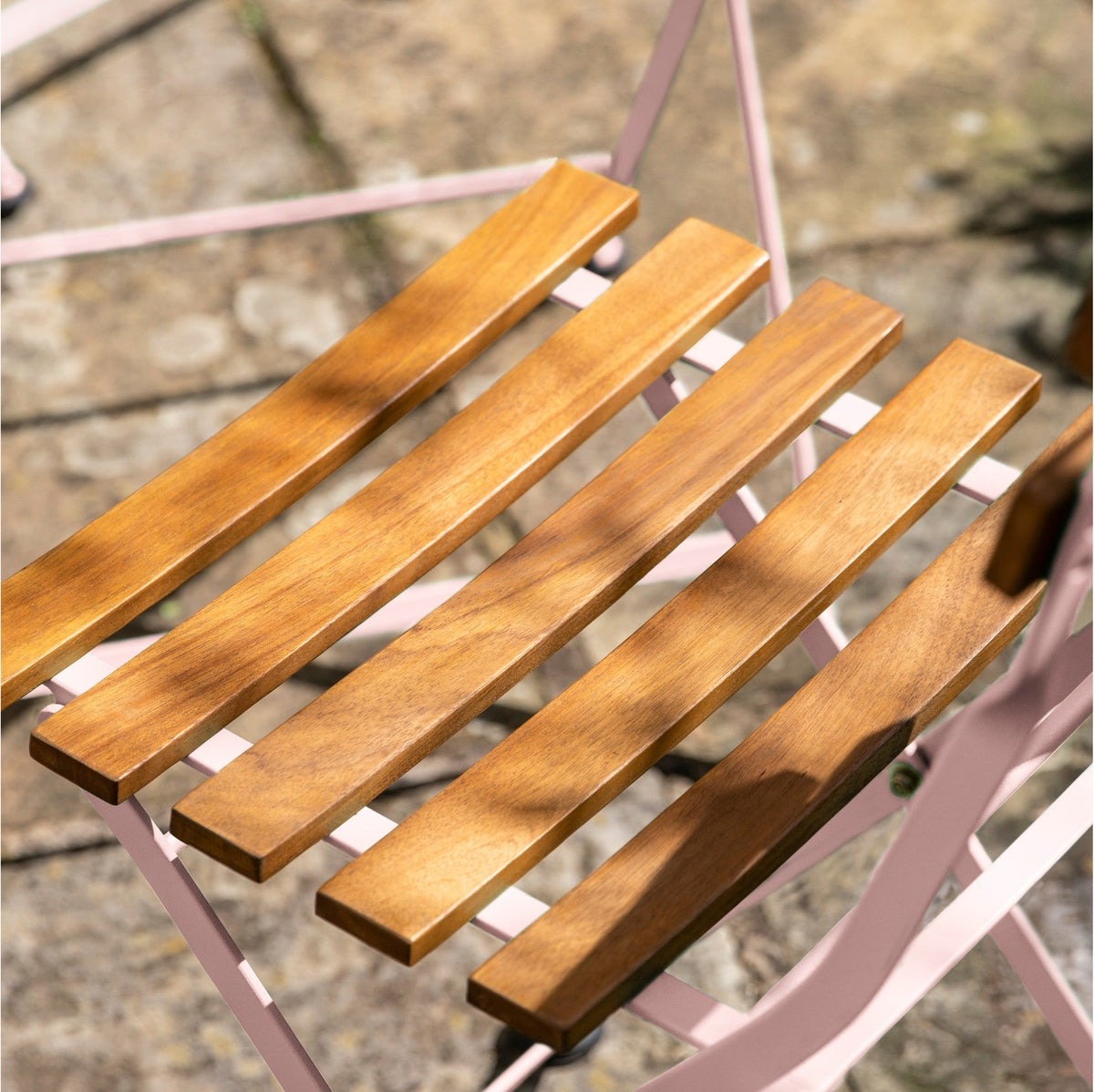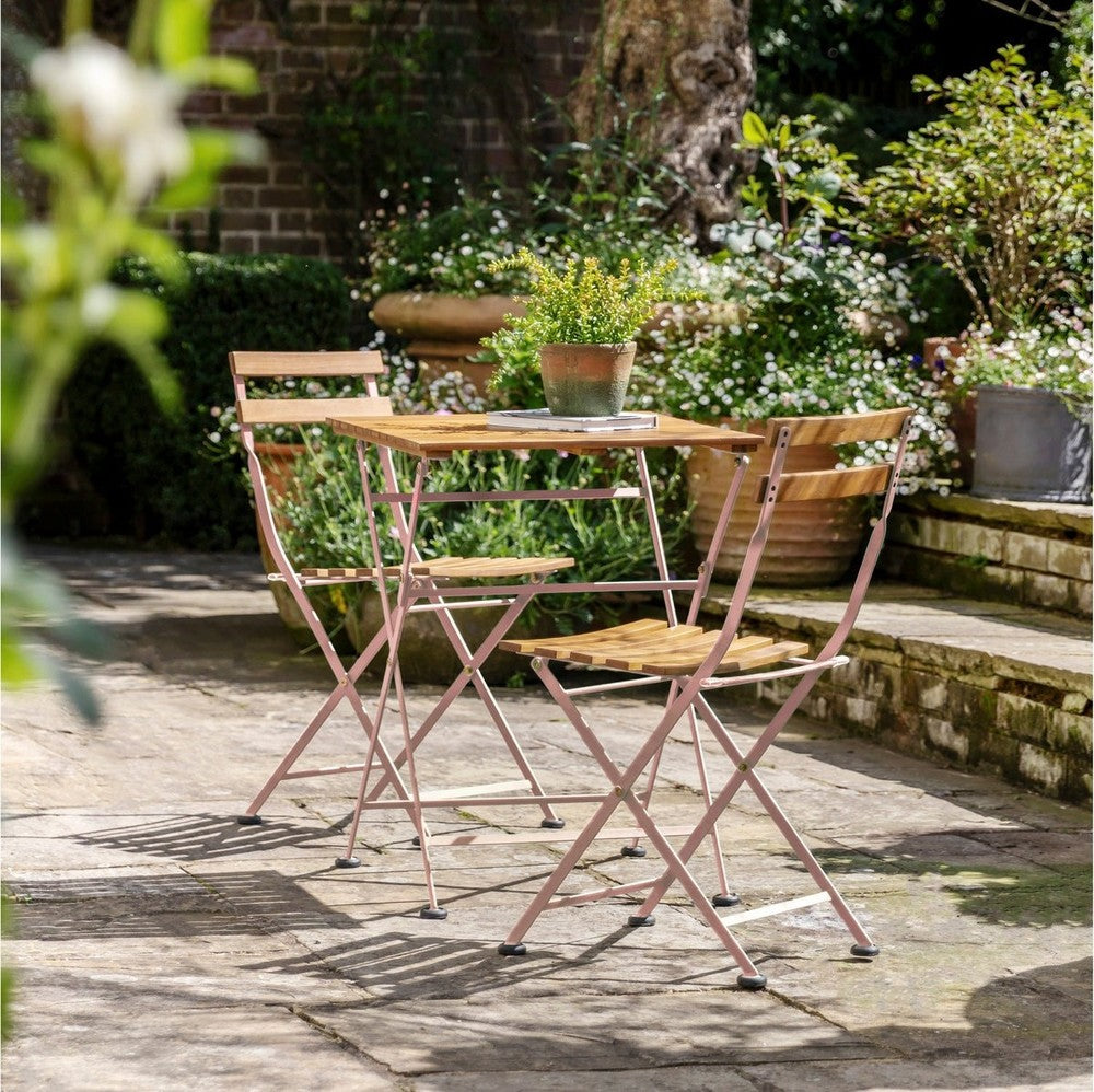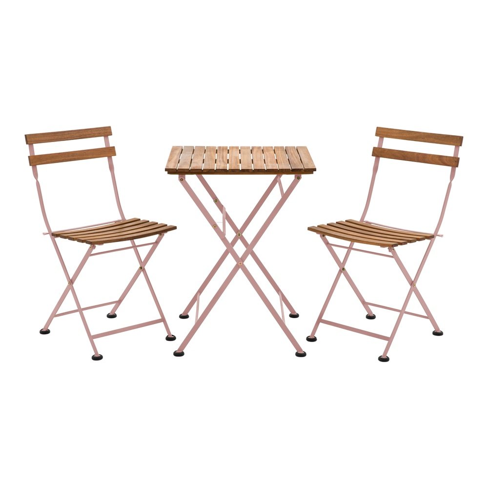 Perfect for balconies or small patios this bistro set will inject a little colour into your outdoor space. The Acacia wood slatted table and seats contrast with the pink powder coated steel frames creating a fun and stylish bistro set. All items fold for easy storage and transportation.