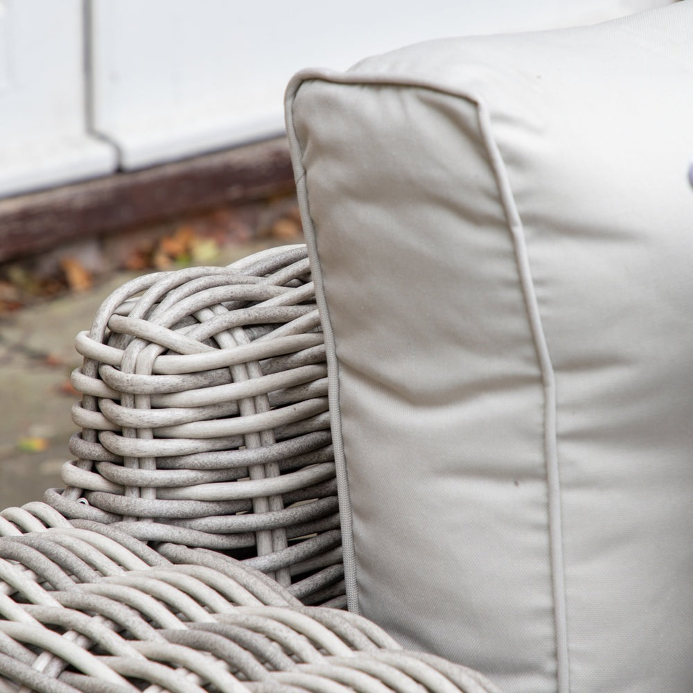 This stunning corner lounge set features wide large seats and extra thick cushions combined with the 9mm full rounded weave rattan to create stylish chunky pieces. The cushions are showerproof and the coffee table has a glass top for added practicality.