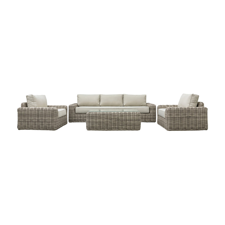 This stunning lounge set features wide large seats and extra thick cushions combined with the 9mm full rounded weave rattan to create stylish chunky pieces. The cushions are showerproof and the coffee table has a glass top for added practicality. It includes a 3-seater sofa, two armchairs and a coffee table, and all the pieces have aluminium frames. A corner lounge set is also available.