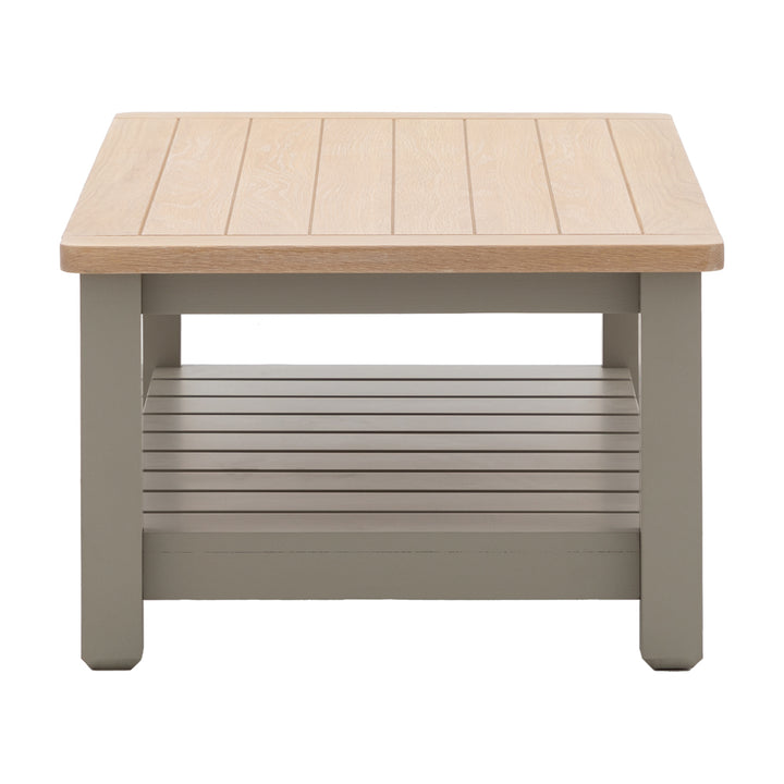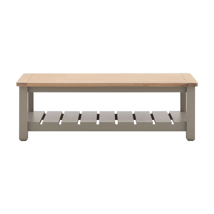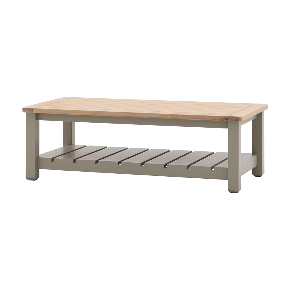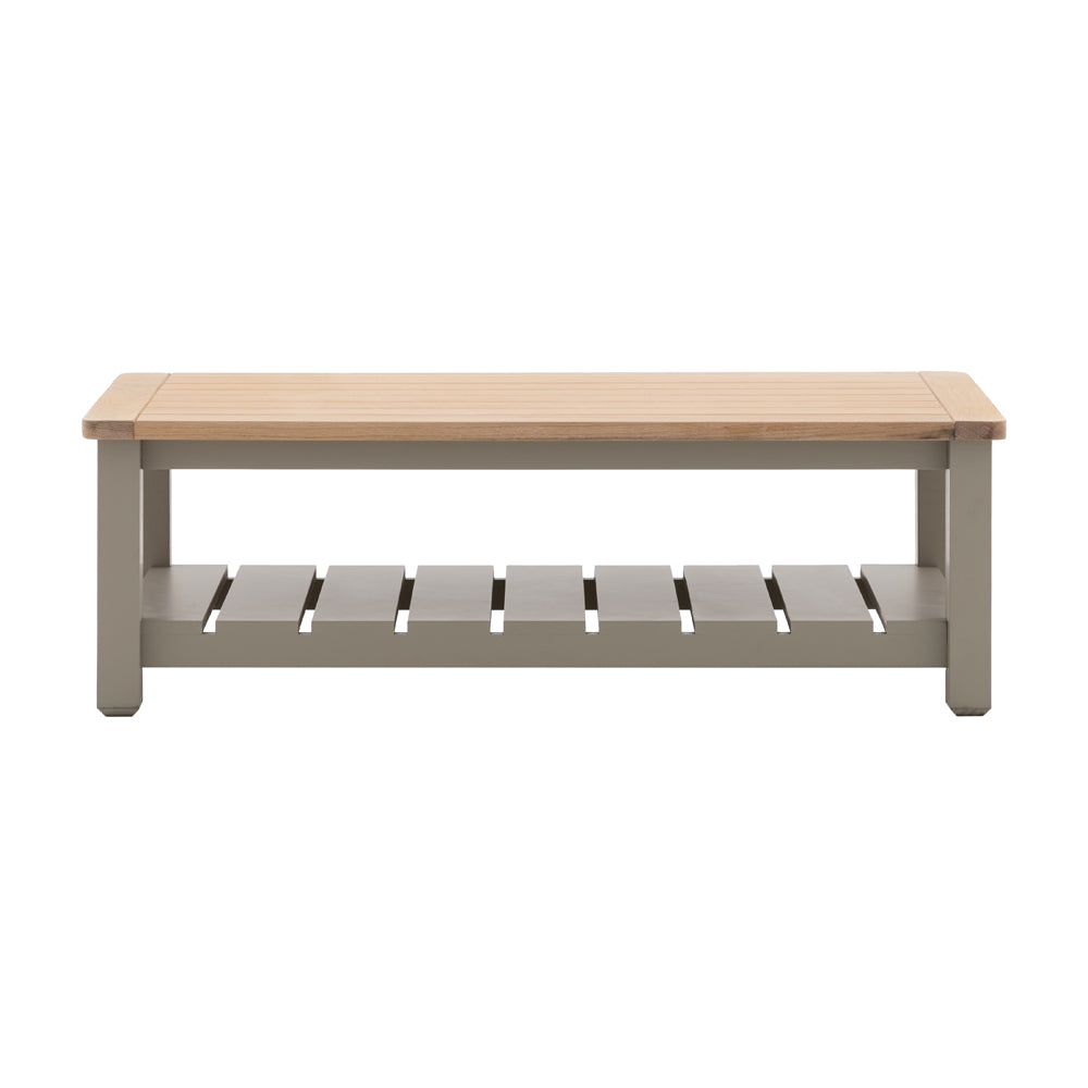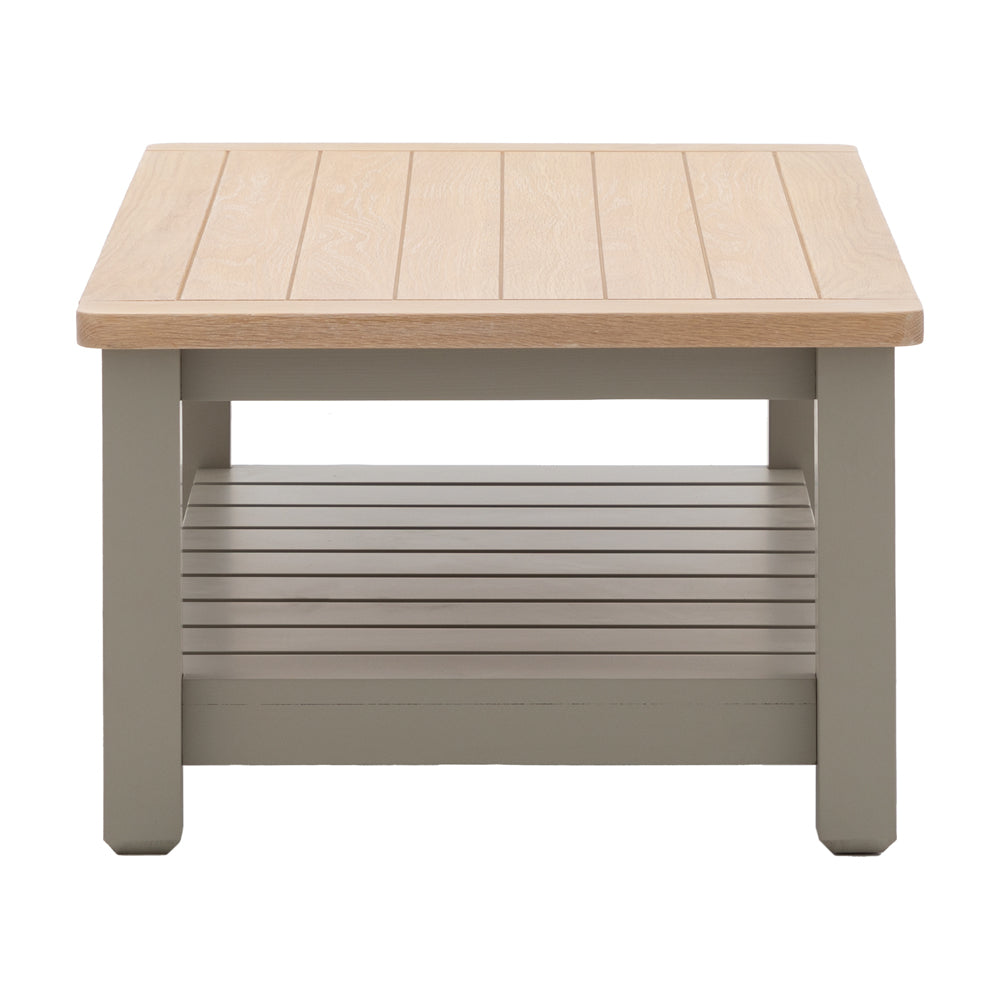 This coffee table is simplicity at its best. The oak top and clean lines make it perfect for a variety of interiors from modern to rustic. The hand painted wood contrasts with the grooved & planked oak top creating a modern twist on a classic farmhouse table. With a storage shelf underneath perfect for books or magazines, it offers a practical and stylish choice.