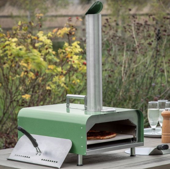 Easy to use this pizza oven will help you make delicious and flavourful pizzas at home. The small size means this pizza oven will comfortably fit any outdoor space. The stainless steel & green finished oven is pellet fed and features a tall chimney and easy to use opening.