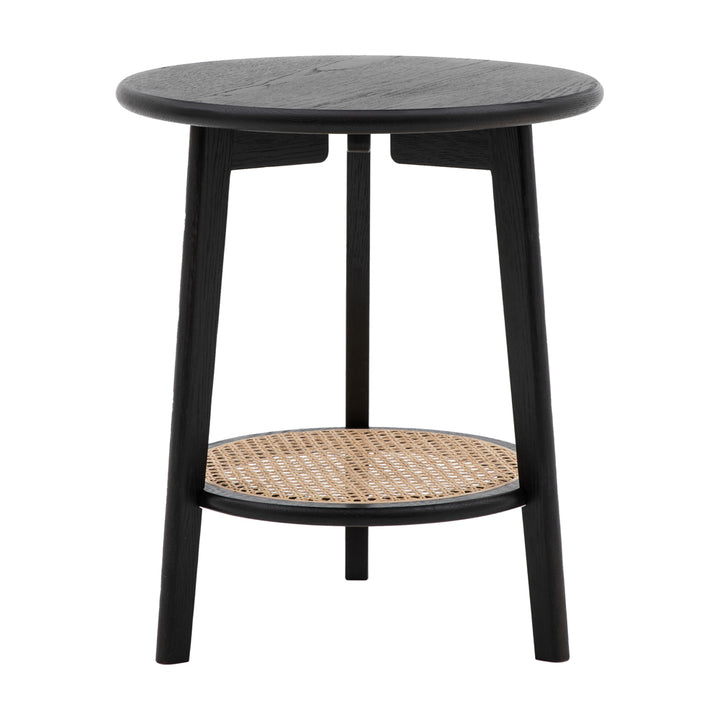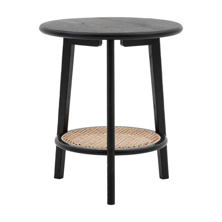 With a hint of art deco this range is overflowing with statement stand out style. In dramatic black stained solid oak the round bedside table is the perfect spot to rest a lamp and bedtime book. The woven rattan lower shelf adds extra storage and a striking contrast of materials and colour.