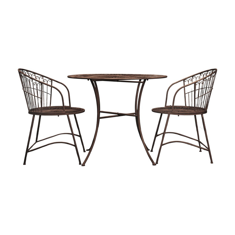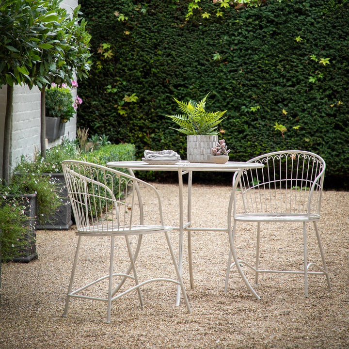 Offering a more unusual take on traditional bistro café style, this set features a flowing design which is echoed in the round seats and lovely curved backs of the chairs. Crafted from metal, it has a lovely distress soft white finish. It is also available in a metal patina finish. Sold separately, we also offer round seat pads, designed to work perfectly with these chairs, to add comfort so you can relax for longer.