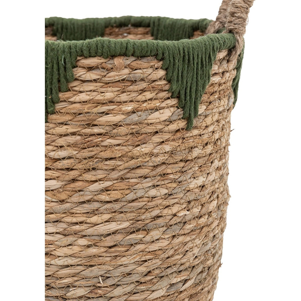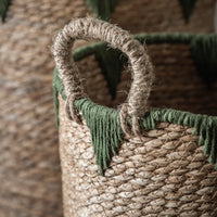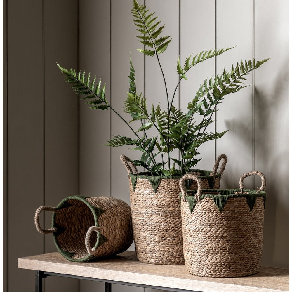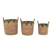 with a natural hyacinth weave mixed with an olive green triangular design embellishment. Set of three characterful hand crafted baskets,