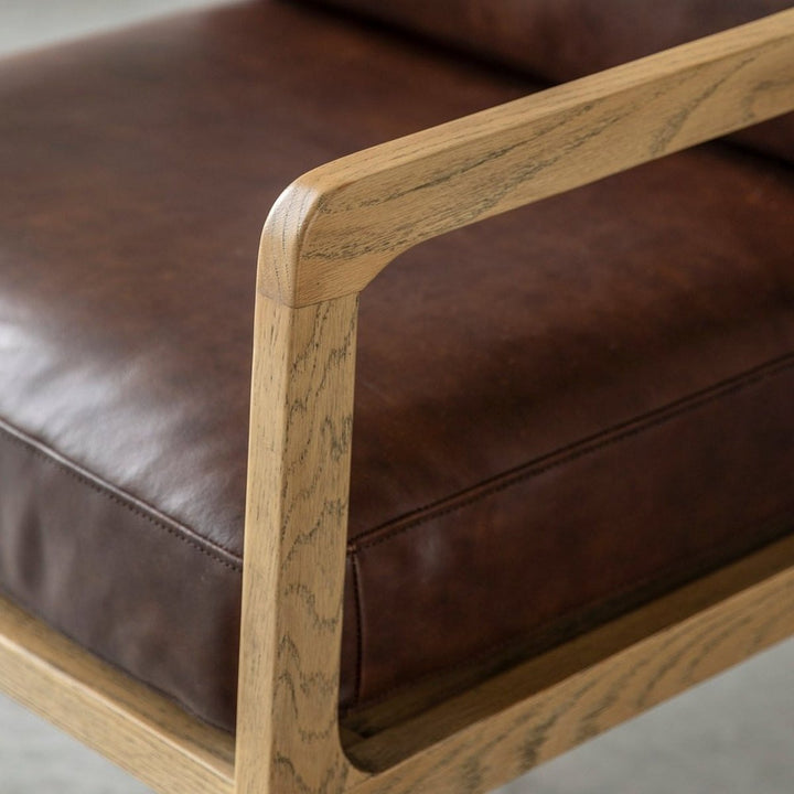 This lovely occasional chair offers a touch of retro style and would look at home in a wide range of interiors. The seat and back cushions are upholstered in brown leather, which pairs beautifully with the wooden frame.