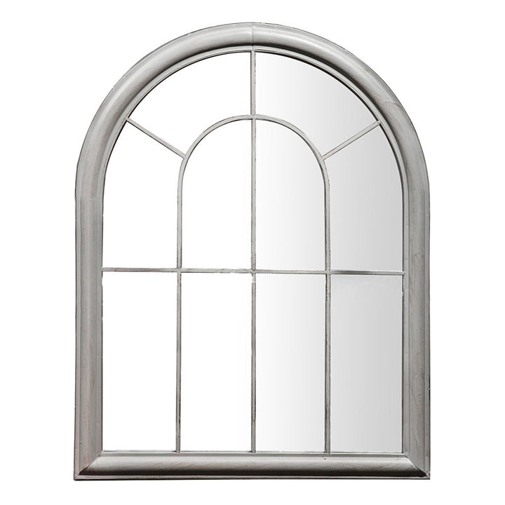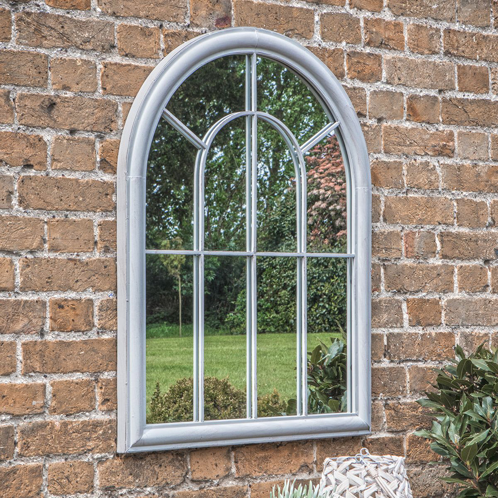 Simple in style, this large outdoor window mirror with arched top in a painted grey finish, adds a new dimension to any outdoor space.