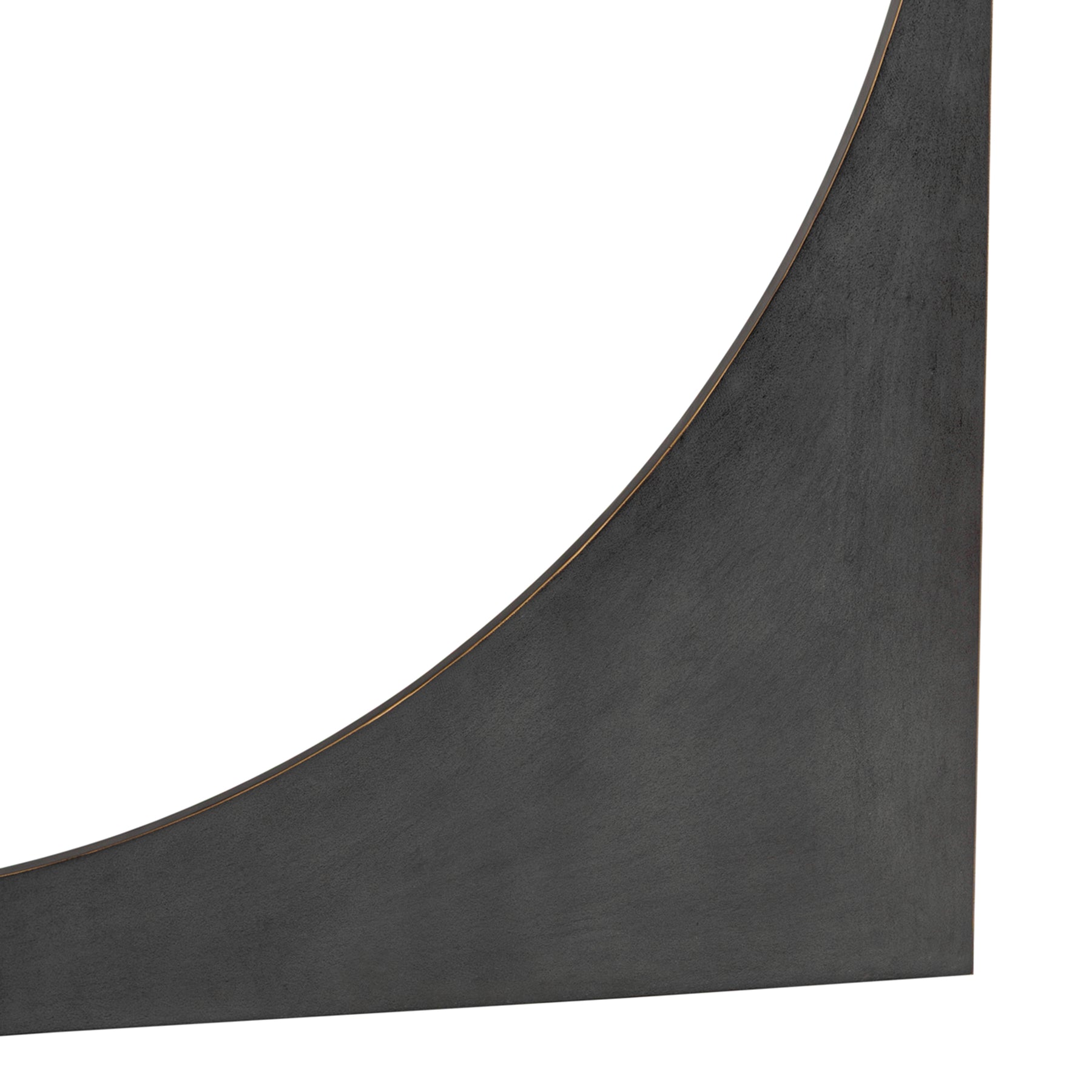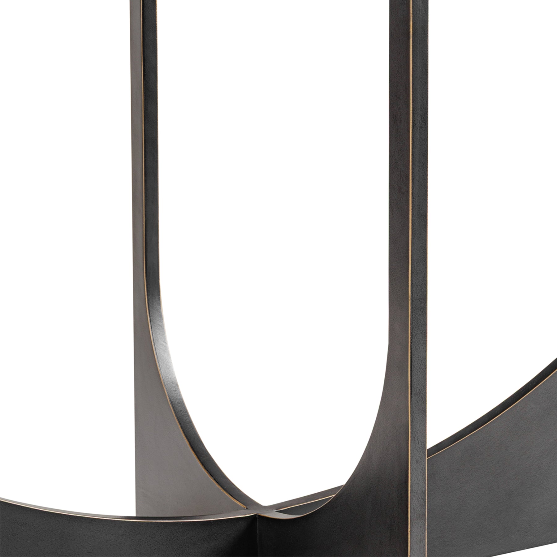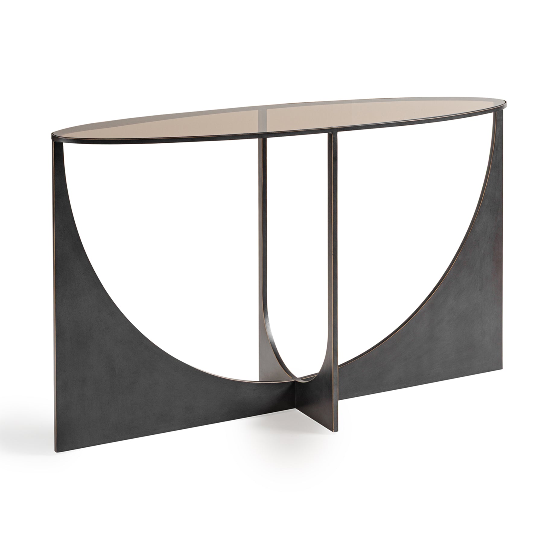 The Glenthorpe Console Table is a sculptural composition of brown-tinted glass and laser-cut iron, finished in hand-applied gilded oak wood. Its sweeping arched base and intersecting curves reflect the growing appreciation for architectural furniture that brings presence without overpowering a space. The pairing of warm metal tones with smoked glass echoes today’s move towards richer neutrals and refined, darker palettes, adding depth and quiet sophistication to contemporary interiors. Pairs seamlessly with the Glenthorpe Accent Table, Coffee Table, Floor Lamp and Table Lamp. W130 x D40 x H77cm