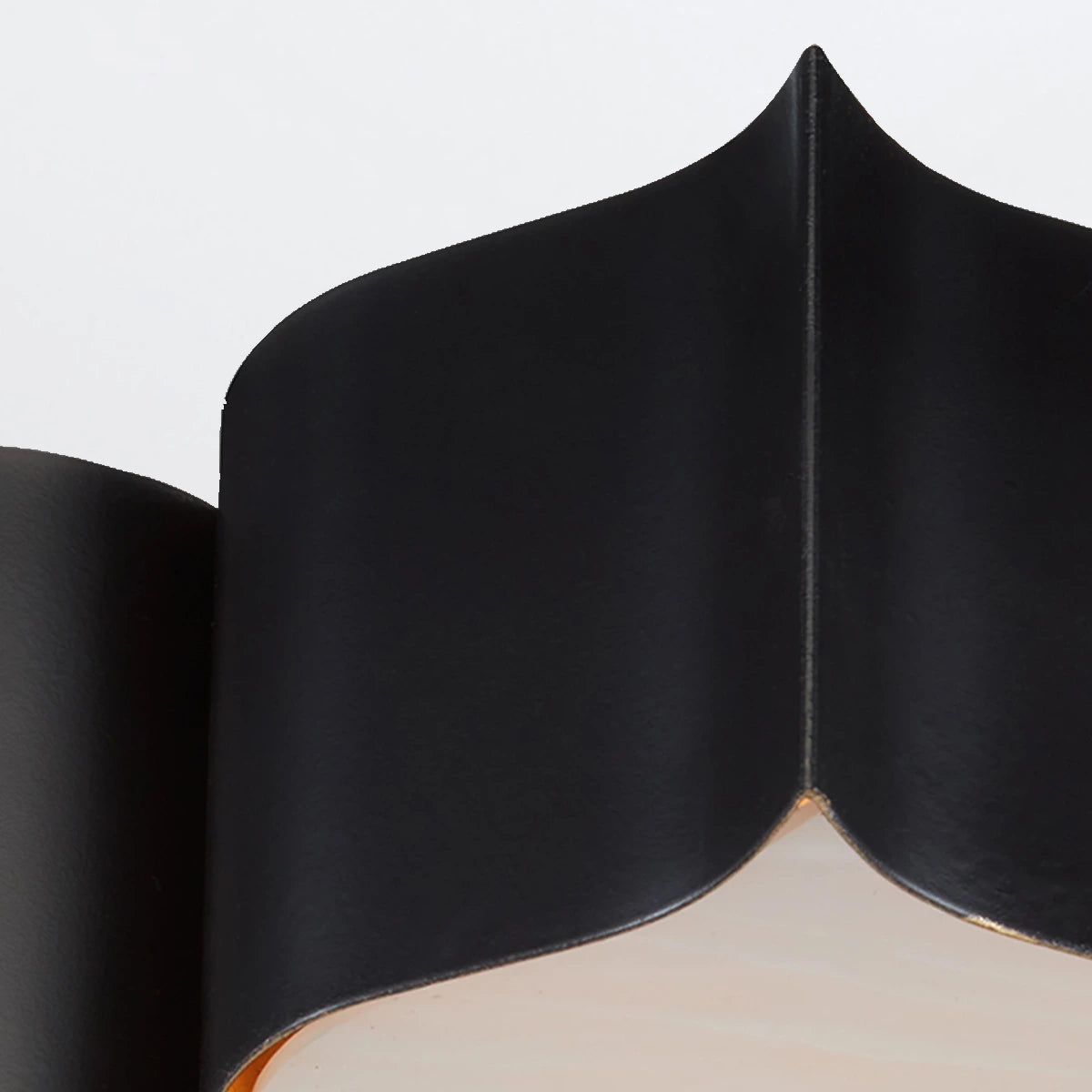 The Grand Lotus Black Flush Mount receives its good looks from a combination of stunning workmanship and a mix of satin black and contemporary gold leaf finishes. The black flush is skillfully fashioned from steel.