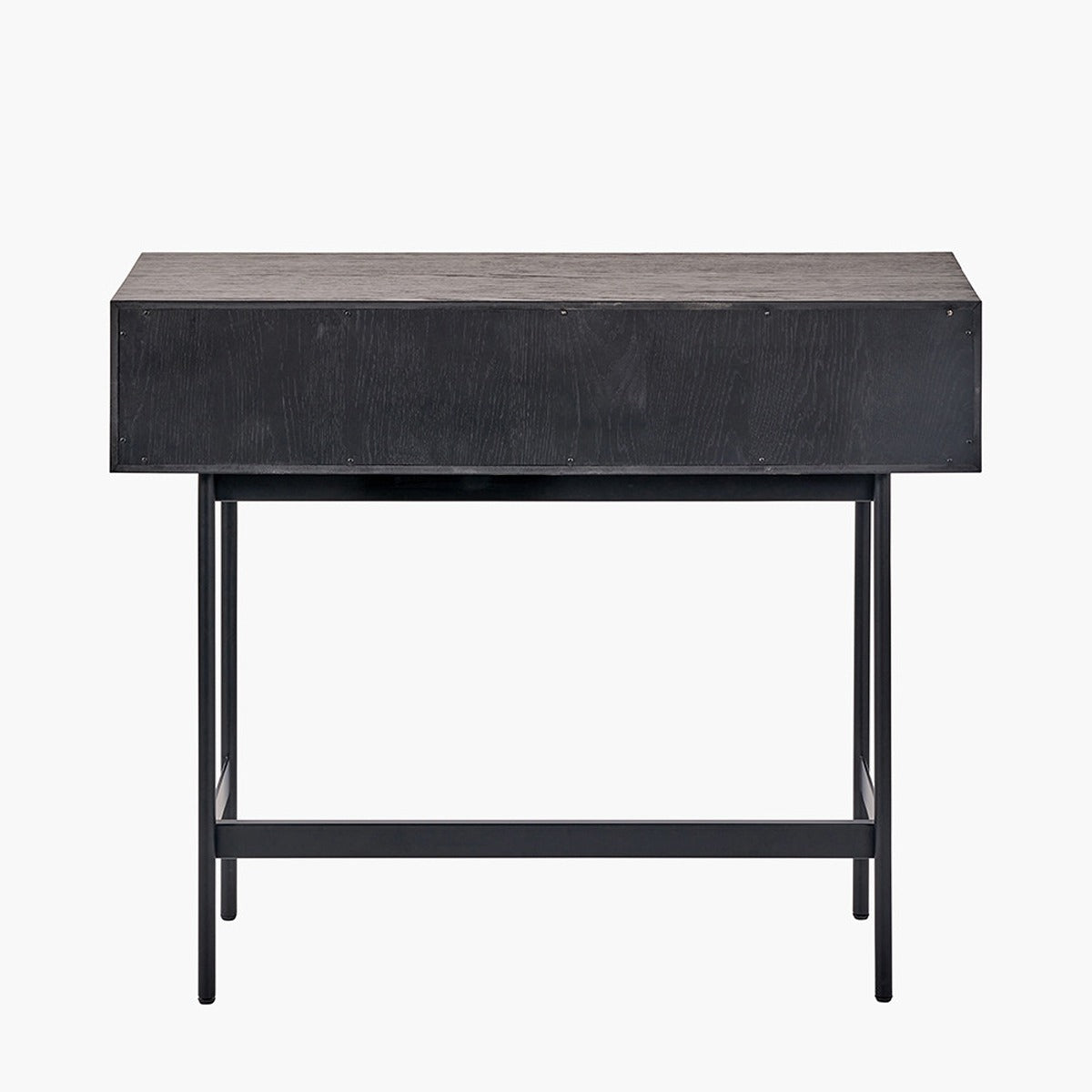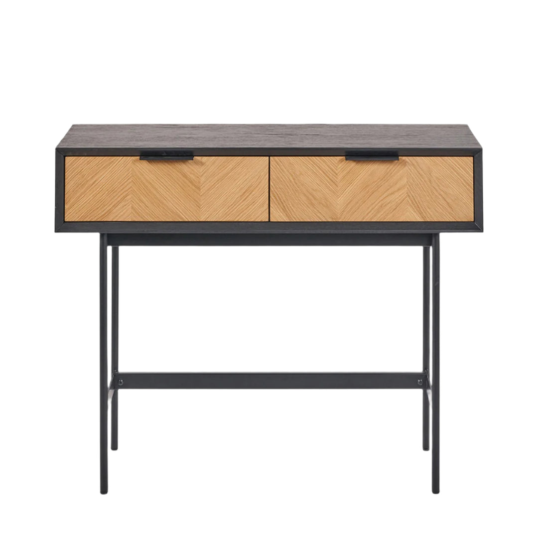 The Haro console table crafted in Vietnam, has a stunning chevron effect oak veneer front, which contrasts perfectly with the black wood, creating a statement piece. The chevron console table offers plenty of storage space within the 2 drawers, which each have a slim black metal handle. The sleek black wooden top is the perfect surface to showcase your home accessories.