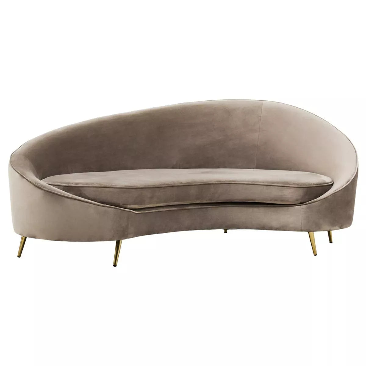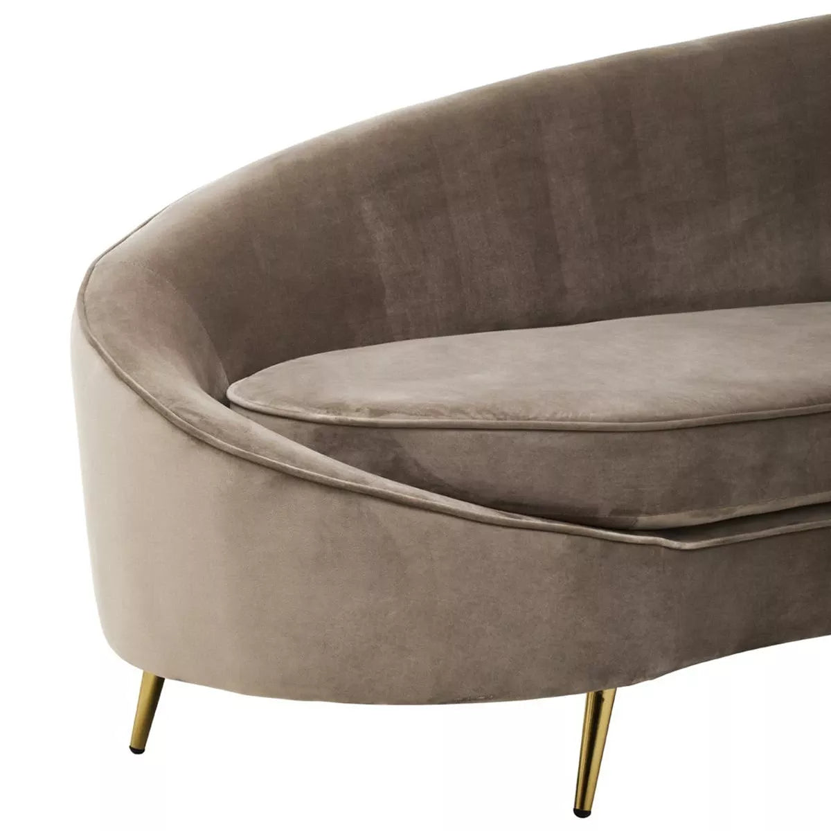 This three-seat sofa boasts a sculptural form with mink velvet upholstery. The back of the sofa is gently curved, flowing seamlessly to create a distinctive, rounded silhouette. The thick foam padding ensures comfortable seating, and the gold finish metal legs provide firm support while enhancing style.