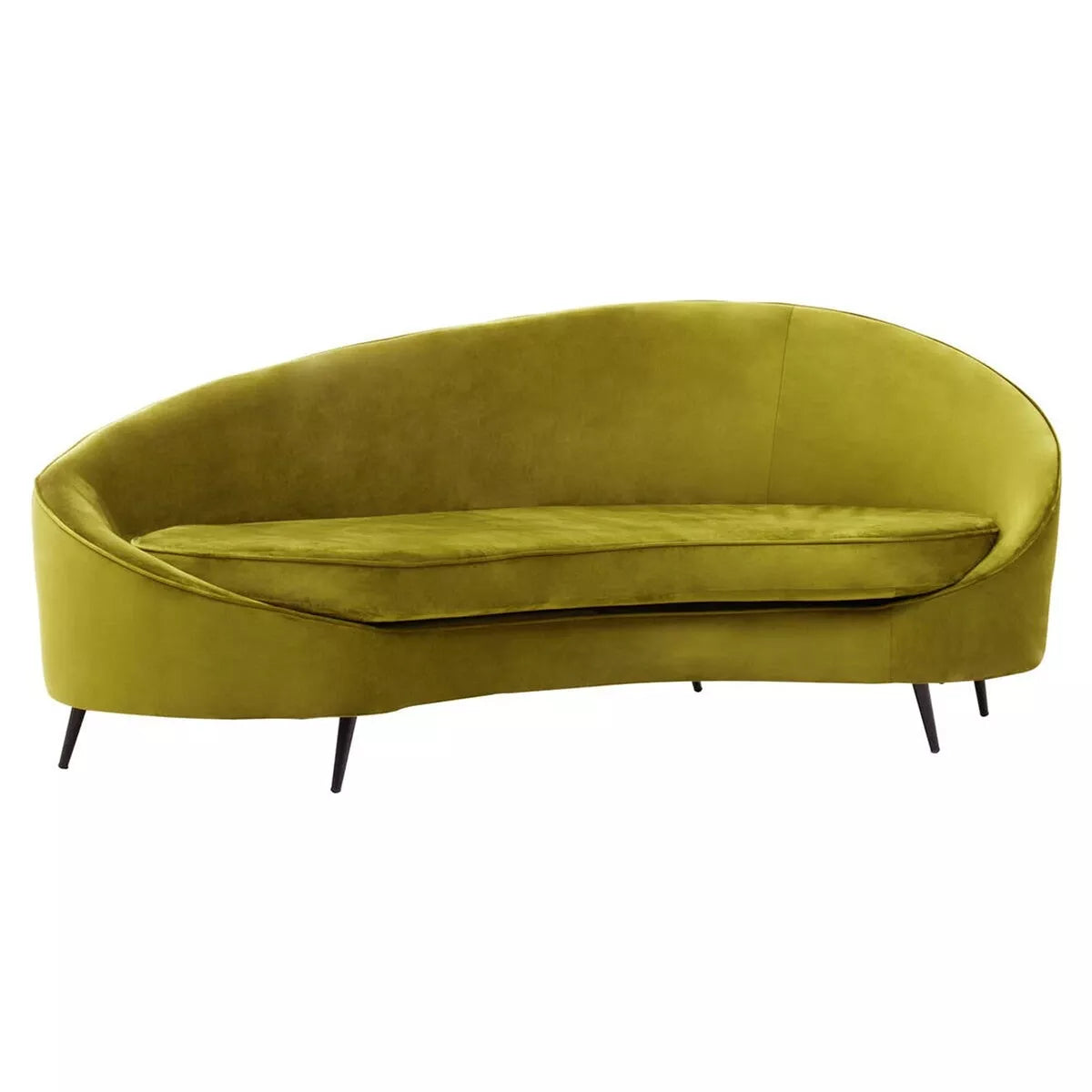 This three-seat sofa boasts a sculptural form with an olive velvet upholstery. The back of the sofa is gently curved, flowing seamlessly to create a distinctive, rounded silhouette. The thick foam padding ensures comfortable seating, and the matte black metal legs provide firm support while enhancing style.