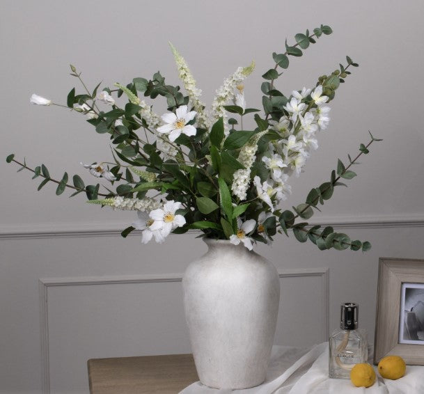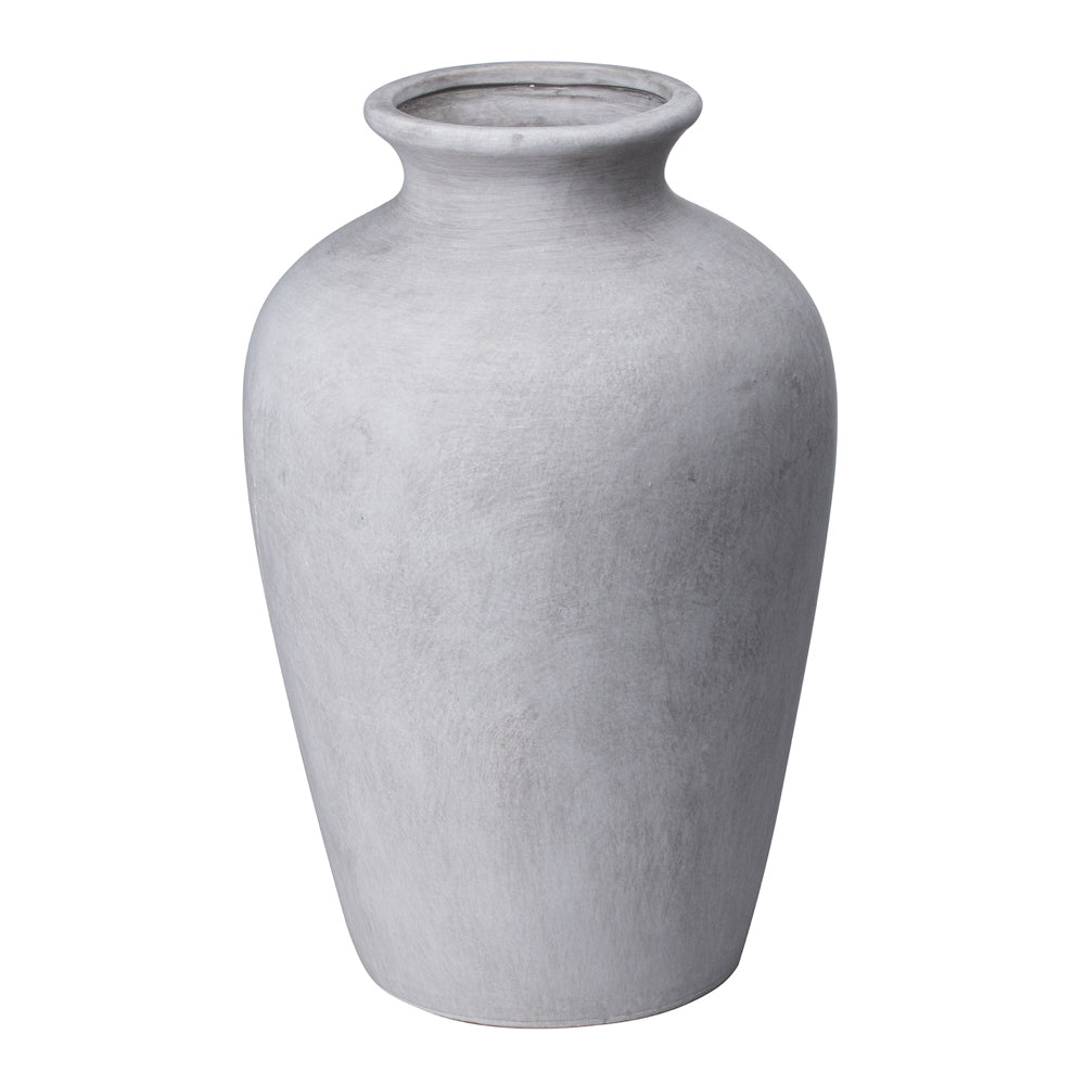 This is the Chours vase, part of our Darcy collection. The Darcy collection encompasses a great mixture or traditional and contemporary shapes. The Chours vase combines a classic shape and timeless colour that will suit a variety of spaces. The natural stone finish to this elegant vase allows you to layer extra texture into a space. The Darcy vases team beautifully with our faux flowers and are intended for faux rather than real flowers: if customers wish to display real flowers in them, they must use a florist's cellophane wrap to contain water.
