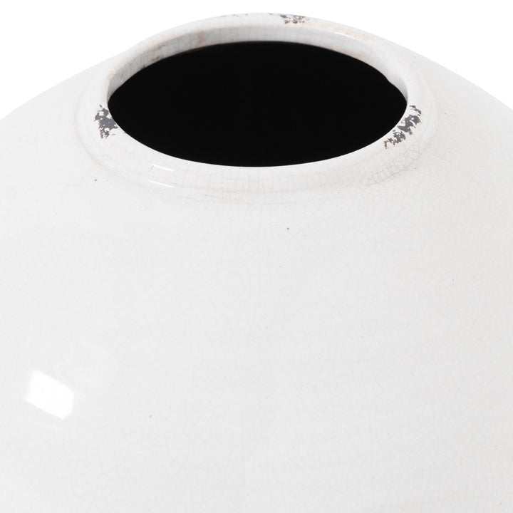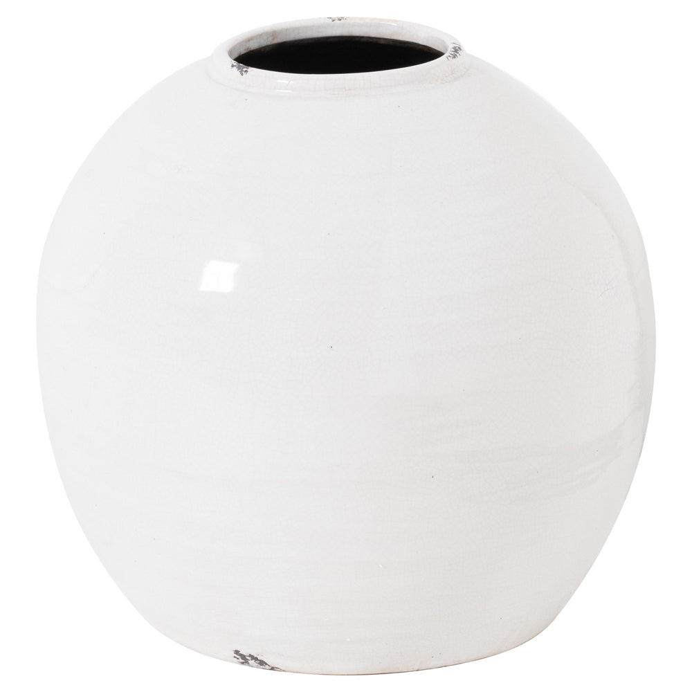 This is the Garda Glazed Tiber Vase in White. A crackle glazed ceramic with distressed details which add wonderful character. Finished in a popular white colourway, this wide-necked vase will set off any number of flower arrangements to perfection. Why not try it with our seeded eucalyptus stems, which can be bent or snipped to your desired height.