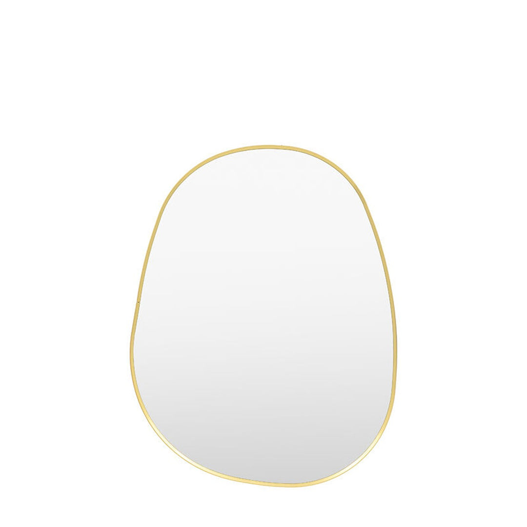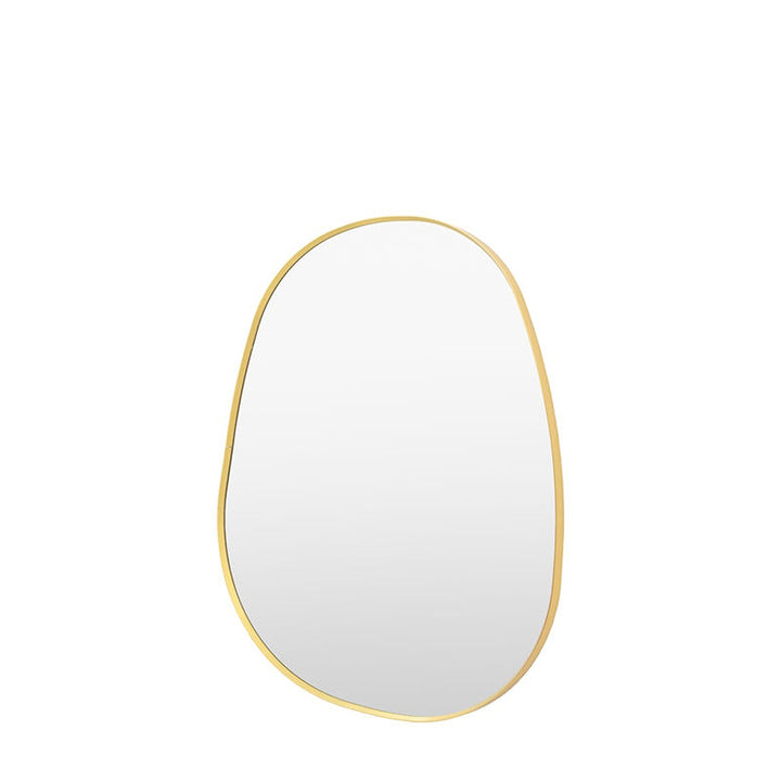 An organic pebble-shaped mirror with a thin gold frame is a striking and contemporary design element. Its natural, irregular form adds an organic softness, while the gold frame provides a sleek, modern edge.