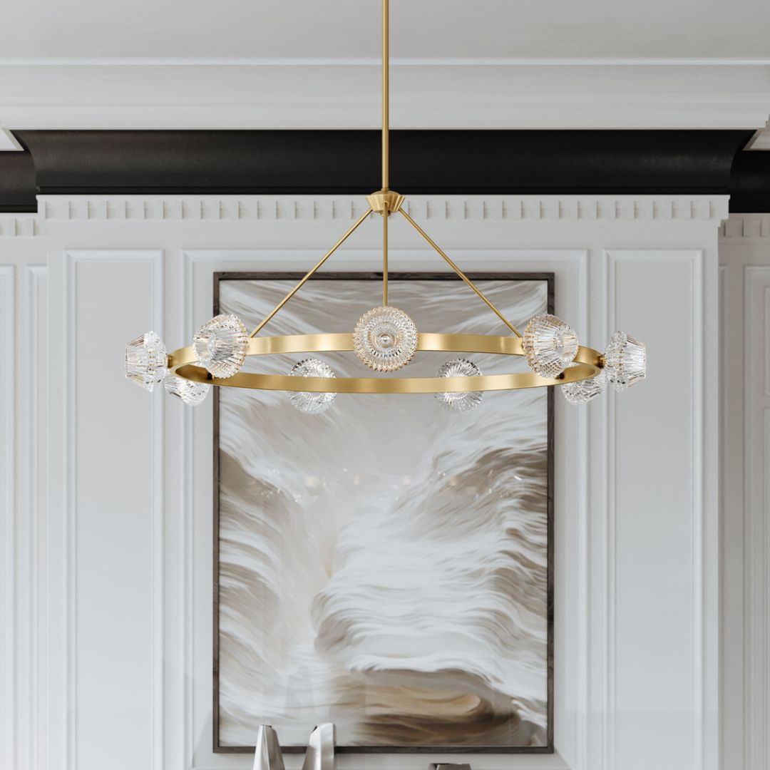 A simple design that produces an extraordinary effect. Light from the opal glossy shades reflects off the hand-crafted vintage gold leaf plates and fills in the ridges of the radial pattern, creating an eye-catching glow.
