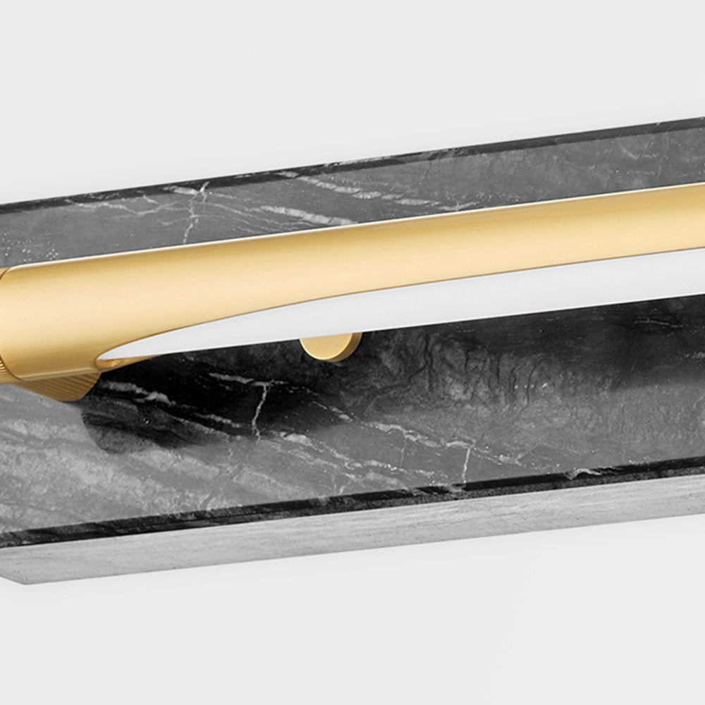 Hayden is where clean, precise design meets elevated, high-end materials. An aged brass tube with exquisitely detailed knurled ends rests upon a rectangular base of gorgeous honed Nero Madera Marble.