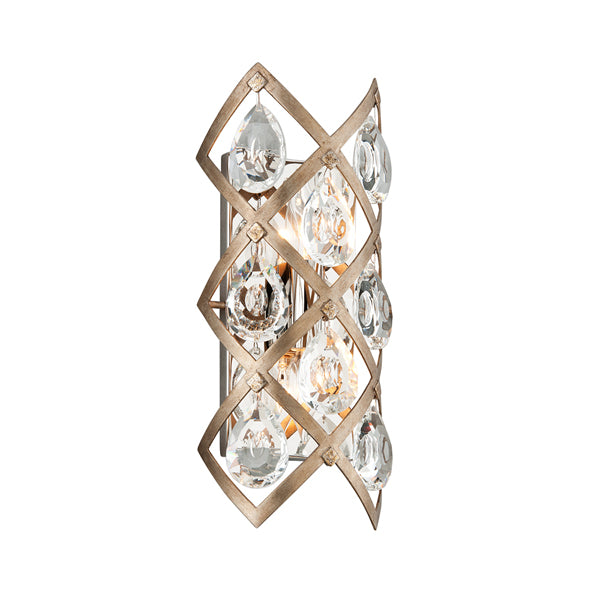 A set of delicately carved crystals are interwoven amongst a brass-finished lattice front, giving this light a truly artistic look. Soft light refracts through the crystals, giving the wall sconce an even more beautiful colour.